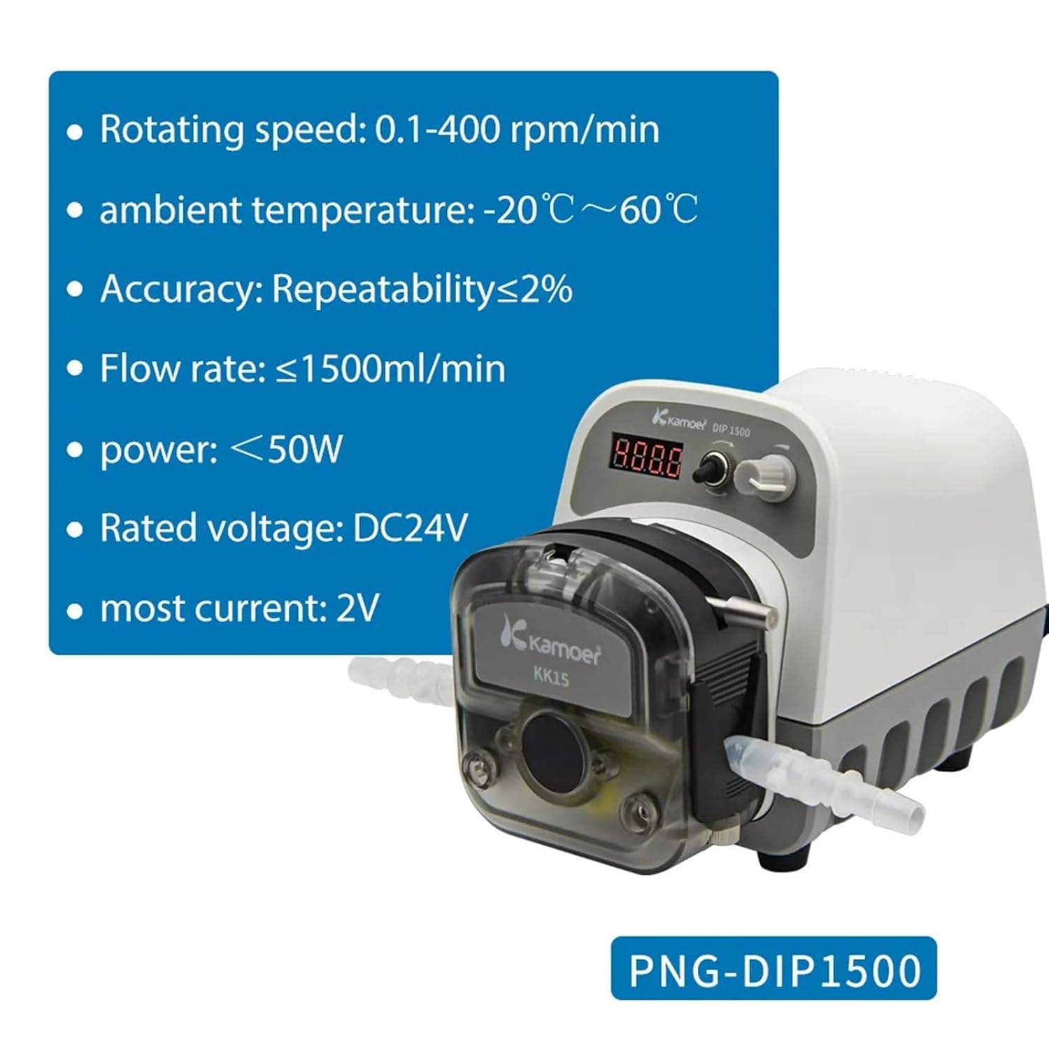 Water PumpsDIP1500 Intelligent 24V Lab Peristaltic Pump Selection Guide1.Know what liquid do you want to transfer?(Imported BPT Tubing Chemical stable; Silicone tubing is suitable for Neutral liquid.)2.What's your bottle volume and how many bottles you want to fill 1 minute?3.Select the tubing size based on the following chart.All the data in the chart is tested on the water.If your liquid is viscous or corrosive, please choose BPT tubing.Pump Head-KK15TubeID: inner diameterOD: outer diameterSpeedrange(RPM)Flow rate(ml/min)Tubing lifetimeTubing working temperature3-rotor Pump headS18ID7.9 x OD11.1mm0.1-4001500200H-60~120Support manual modeSupport fully automatic cycleSemi-automatic cycleManual start/stopSpeed controlBasic ParametersVoltage: 24VPower: Less than 50WCurrent: 2A maxFlow range: 1500ml/minPump tube: SiliconePower supply: External power adapterWorking temperature: -20~60Range of rotation: 0.1rpm-400rpmSpeed adjustment resolution: 0.1rpmControl method: Encoder, toggle switch, external analog signal control, RS485 communication control, foot switch controlExternal analog signal control: 4-20mA, 0-5VDisplay mode: LED 4-digit digital tube, Speed display, duration displayWorking mode: Fully automatic cycle, semi-automatic cycle, manualSupport function: Start and stop, forward and reverse, speed adjustment, etc.The back of the pump(picture is GB type)Left is Combination control powerRight is Power socketVarious Applications# Canned liquid# Laboratory# Food industry# More DetailsNo 1: reservedNo 2: 485 BNo 3: 485 ANo 4: Foot switch +No 5: Foot switch -No 6: Analog signal 5V-No 7: Analog signal 5V+No 8: Analog signal mA-No 9: Analog signal mA+Combination control port1. 485 communication (2, 3 feet)2. External start and stop control (4, 5 feet)3. Analog signal control 0-5V (6, 7 feet)4. Analog signal control 4-20mA (8, 9 feet)Size: 120*210*155.5 mm(Include pump head)Note: There is an error in manual measurement, please refer to the design drawing size.