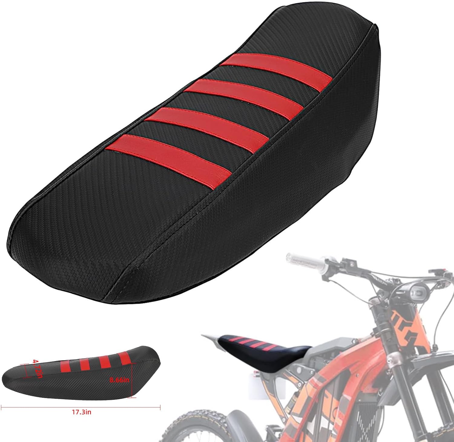 Fitment: For Sur Ron X/S (Better for Heighten and Widen Seat Cushion) Features: never mounted. Made of high elastic rubber, skin-friendly material, long-term outdoor use does not age and crack. Thanks to the high elasticity of rubber, it is also suitable for widened and thickened seat cushions. 4 colored stripes are woven on the surface, which can provide better anti-skid capability for the dirt bike seat cover. The surface of the dirt bike seat cover is made of carbon fiber texture, and the color stripes take the minimalist sports style to the extreme. A variety of color seat covers can give motorcycles more matching possibilities. You can pull it to a certain extent when fastening it to maintain moderate elasticity. If you have any questions, contacting us anytime. Specification: Material: Rubber Color: As Pictures Package Includes: 1 * Dirt Bike Seat Cover for Heighten and Widen Seat Cushion No Manual