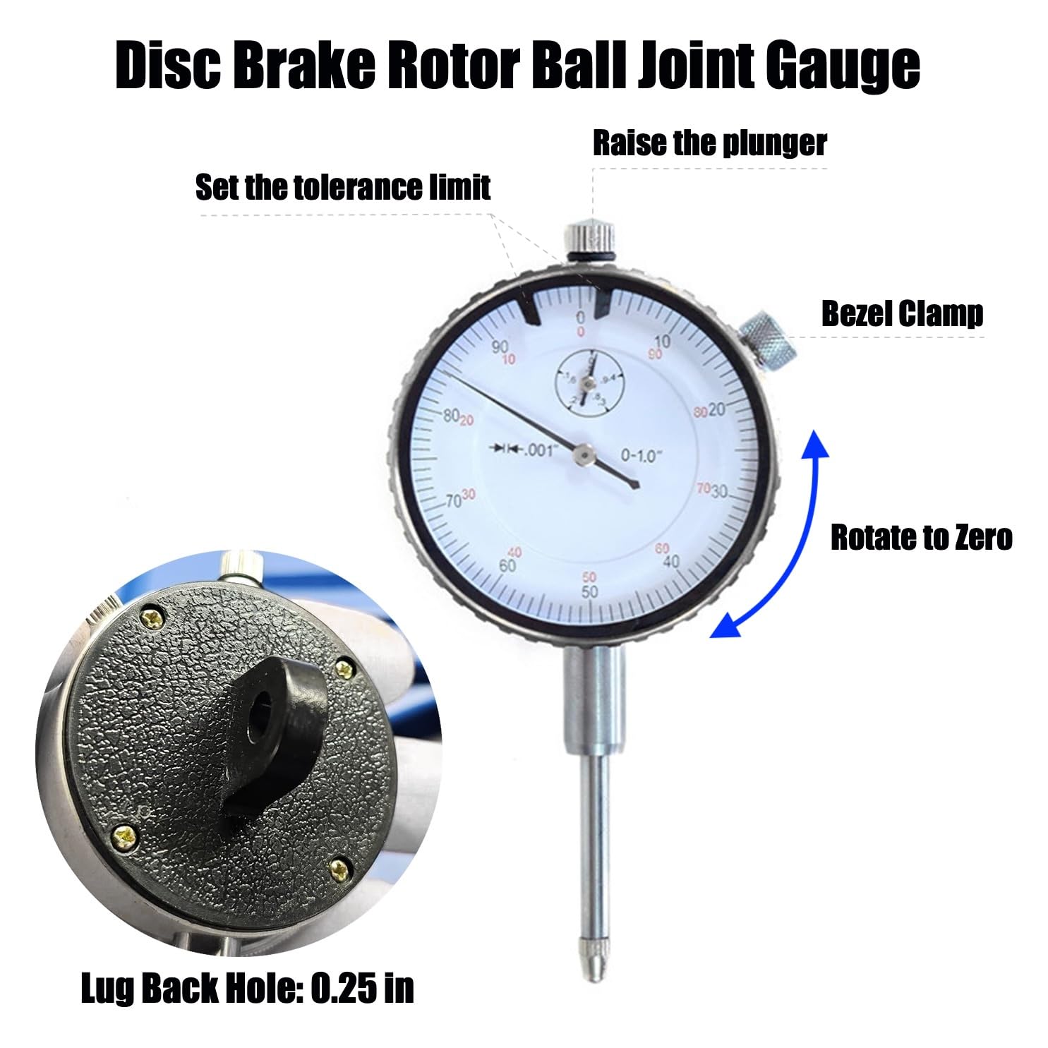 Disc Brake Rotor Ball Joint Gauge, 0-1” by 0.001” Dial Indicator, Automobile Brake Disc Flatness Runout Backlash Measuring Tool, with 13” Flexible Stem Holder & Locking PliersDial indicator gauge set specially designed to inspect the flatness and detect deformation of brake disc by measuring its warpage accurately, used for measuring the run-out of brake discs rotor, drive flanges or any rotating parts for warping, gear for backlash, valve guide and ball joint for wear and tear, etcBrake rotor ball joint gauge dial indicator offers a measuring range 0-1'', resolution 0.001'', easy to zero, which can be installed firmly to the flexible stem holderDisc brake rotor ball joint measuring tool features a 360-degree rotating flexible stem holder, 13” long, enabling you to attach and rigidly lock the dial indicator to the brake disc in your desired positionBrake rotor ball joint runout gauge set equipped with a simple vise grip to lock the indicator and flexible arm onto any convenient suspension bracket or componentAutomobile brake disc flatness run-out backlash measuring tool comes with a blow molded case to well organize and safely store the flatness measurement tools, portable to use on the goNotice to UseBefore measurement, be sure to fix the brake disc diagonally.The locking vise can produce a strong clamping force so do not clamp it on plastic or rubber parts to avoid damage.The entire set of measuring tools must be firmly fixed to prevent measurement errors caused by vibration due to loose assembly.Never over-tighten the screw, or the dial indicator might be damaged.SPECIFICATIONWarpage Measuring Range 0-1 inResolution: 0.001 inStem Holder Length: 13 inDial Indicator Lug Back Hole: 0.25 inCase Size: 11.4*7.1*0.3 inPACKAGE1 x 1” Dial Indicator1 x Flexible Stem Holder1 x Vise Grip1 x Storage Case