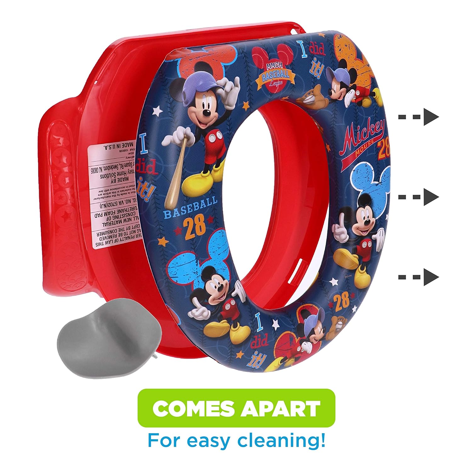 Your little one can be an “All Star” at potty training with this Mickey Mouse potty training essentials starter set! This Essential potty training set includes a soft potty seat and matching step stool- the most important items that your little one needs to start using the adult toilet! The potty seat is constructed with durable plastic and built to last. The Patented, Easy Grip Handle design helps your little one feel safe & secure on the toilet and aids in building independence throughout the potty training process. To keep this potty seat hanging around, there is space on the back for a potty hook that can hang on the toilet tank or elsewhere in the bathroom! This soft, cushioned seat is a welcome alternative for children to use versus hard plastic ones. Also included is an easy to install, soft, contoured splash guard that redirects unwanted splashbacks that may occur during potty training. All components come apart for an easy clean that gets every inch. These seats are a safe option all around as they are both BPA & Phthalate-Free. This potty seat fits on most regular & elongated toilet seats so it is ready to use anywhere in the house as soon as your child is! The matching lightweight step stool is a must have complement for your child to gain independence using their new potty. With a contoured shape, this step stool is perfect for placing right against the base of the toilet so it is there for when your child needs it. Featuring a skid-resistant base and non-skid inset on top, this stool creates a secure footing with every use. Notched sides allow for your child to easily move this stool on their own wherever they need it- by the bed, at the sink, in the kitchen, and more!