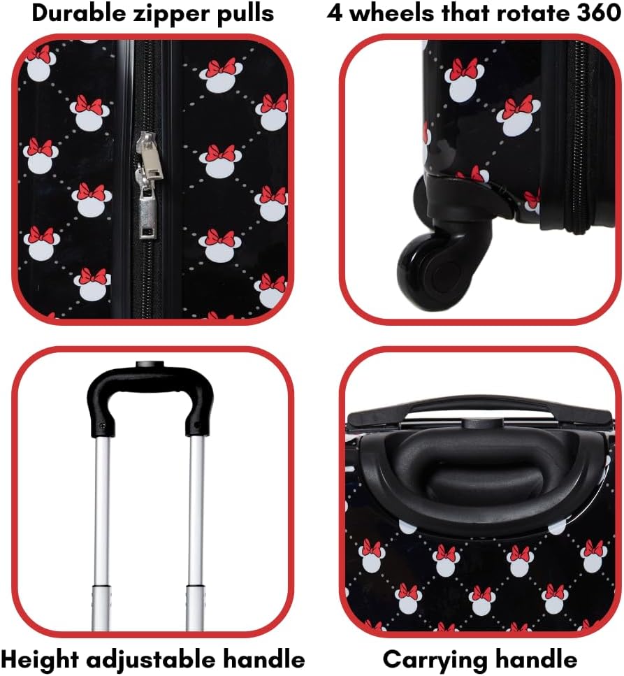 Get ready for an enchanting adventure with the Disney Minnie Mouse Carry-on Luggage for Girls! Designed with the iconic Minnie Mouse print and adorable red bows, it's a must-have for young Disney fans. This 20-inch hardside suitcase is not only visually delightful but also highly practical and durable. For easy transportation, the luggage features a retractable handle that can be safely stored when not in use, allowing kids to manage their own packing. Its compact size fits perfectly in plane overhead compartments, making it ideal for travel with kids. Equipped with high-quality spinner wheels that rotate 360 degrees, this carry-on glides effortlessly, even in the hands of little travelers. Its lightweight construction ensures that kids can easily maneuver it through busy airports and crowded spaces. Inside, the suitcase offers a roomy interior to store all your little one's essentials for weekend getaways and sleepovers. Cross straps ensure belongings stay securely in place during travel, while a handy zipper pocket allows for organizing smaller items separately. Want to create the ultimate Disney-themed travel set? Pair the Minnie Mouse luggage with a matching Minnie Mouse backpack to complete the enchanting look. Your little one will be thrilled to pack all their cute accessories and travel necessities in this delightful duo. Give the gift of magic and practicality with the Disney Minnie Mouse Carry-on Luggage for Girls. Let your child embark on every journey with their beloved Minnie Mouse, keeping their belongings organized and ensuring a stress-free packing experience. It's the perfect companion for young adventurers with a love for all things Disney!