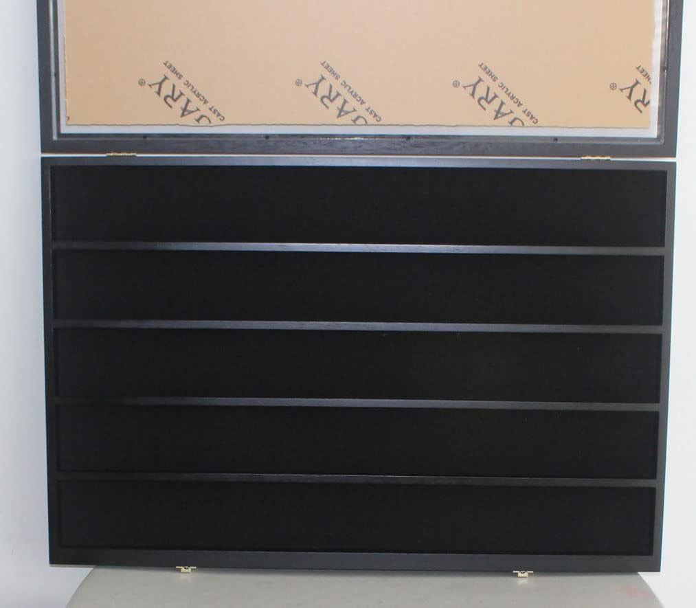 Display case to hold 60 Decks of regular size poker cards. Repeated sanded to achieve smooth and elegant appearance. Acrylic door cover to protect from dust and damage. Lipped edge on each shelf. Brass hinges, door latches, and wall brackets to hang (Wall mounted). . Outside Dimensions: 32.25” X 23”H X 2.25”D. Interior Shelf Width: 31.25”. Interior Depth: 1.45”. Row Height is 3.8”. No assembly required. Playing Cards NOT INCLUDED.