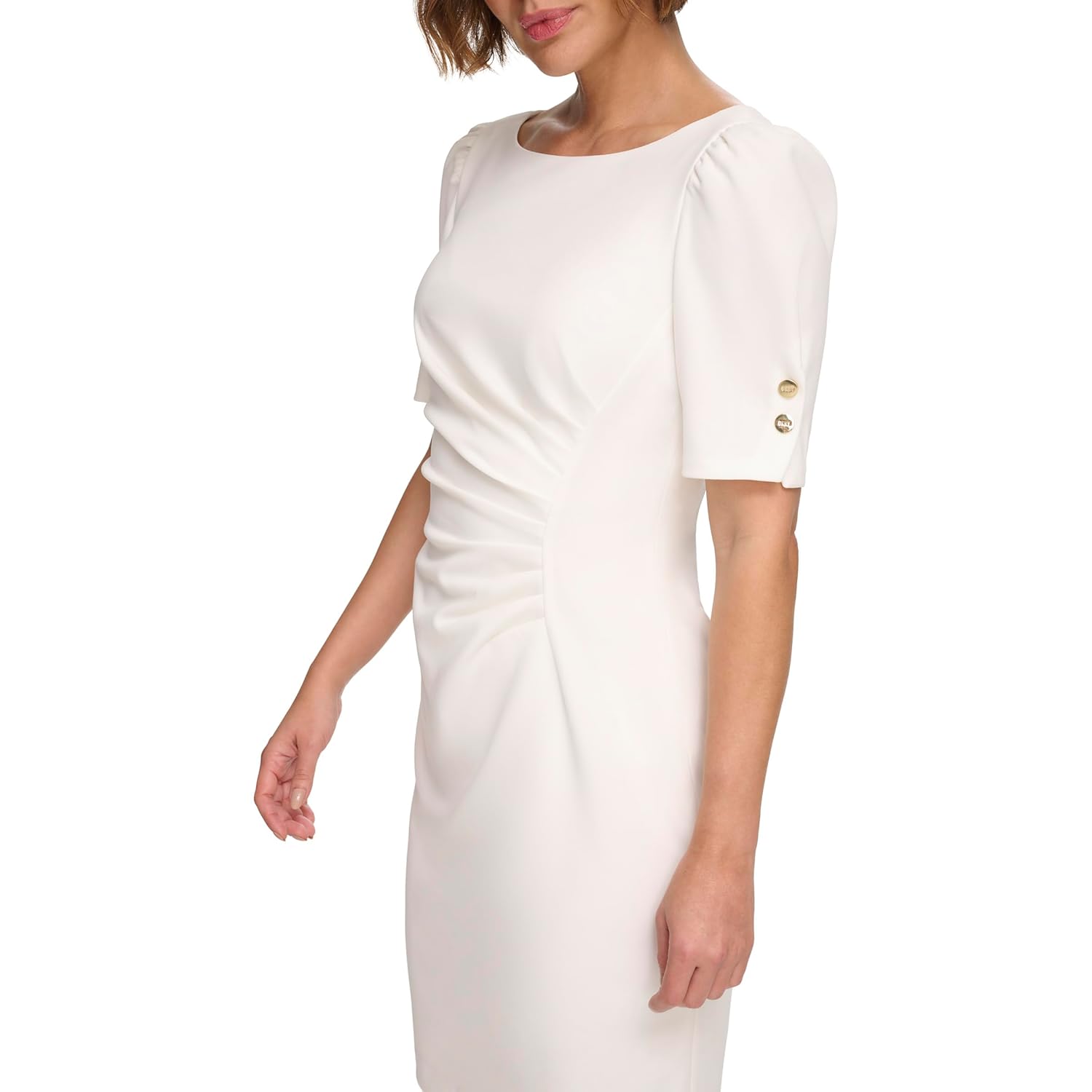 | Style Name | Short Sleeve Ruched Knee Length Sheath Dress With Button Detail |