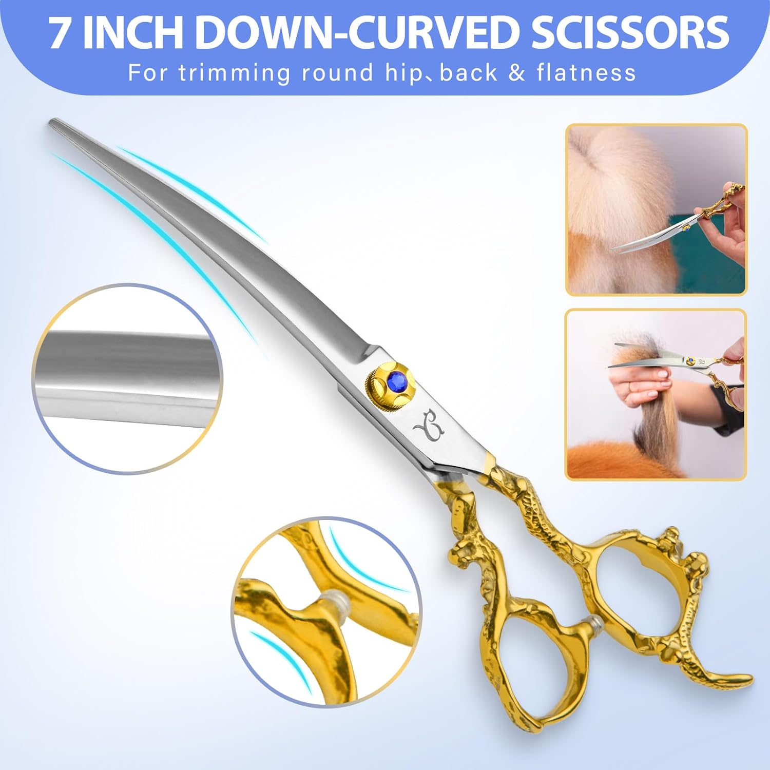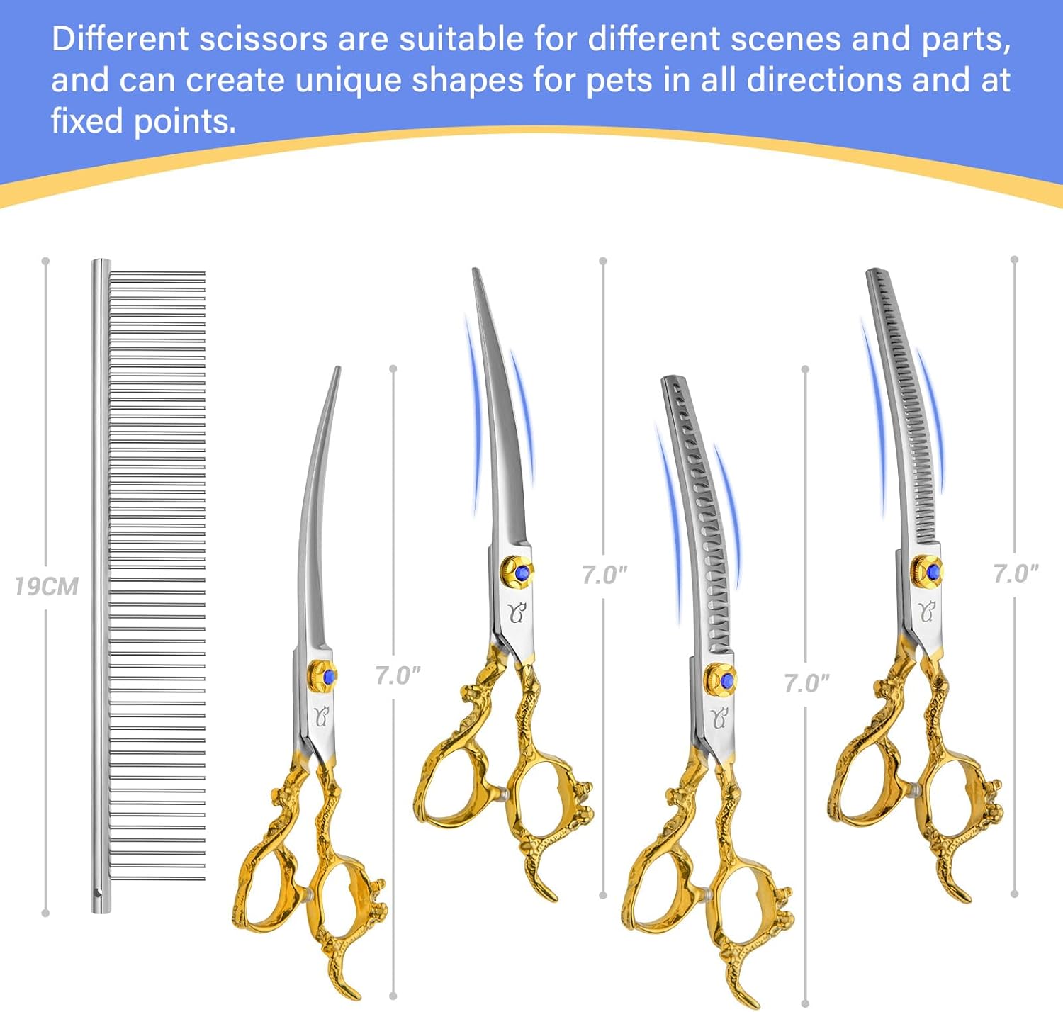| Included Components | 1*19cm dog comb and screw regulator + wiping cloth+black bag, 1*7.0 inch curved chunkers scissors, 1*7.0 inch curved thinning scissors, 1*7.0 inch down-curved scissors, 1*7.0 inch up-curved scissors |