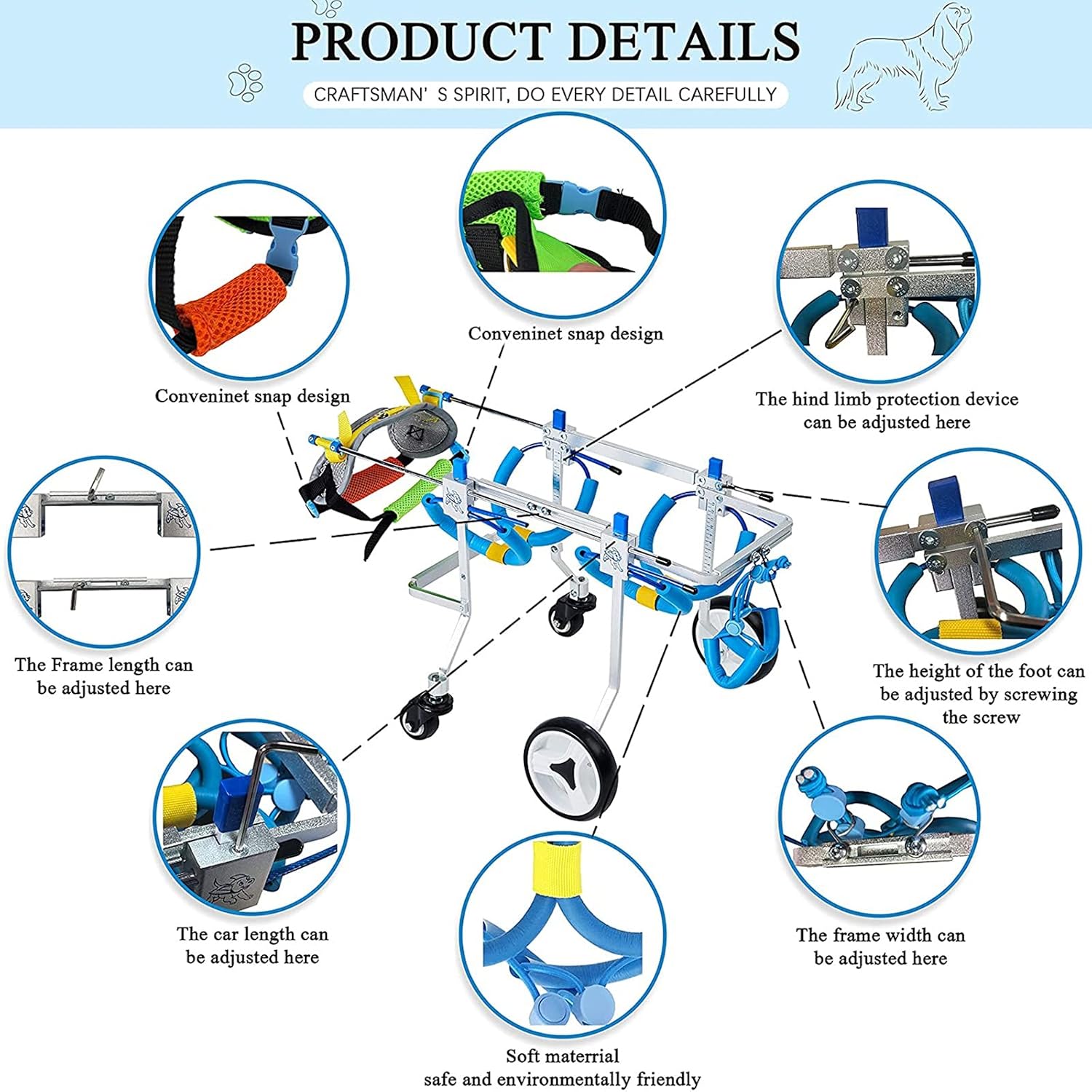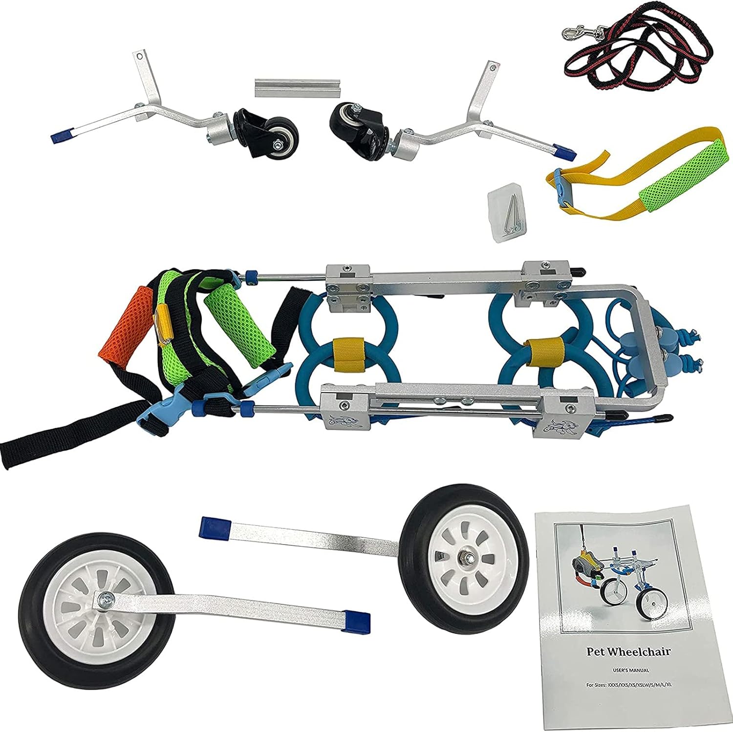 ❥Caring for pets, letting pets run again!-The height, width and length of this pet wheelchair can be adjusted, and it can adapt to your pet within a certain range. -The whole product is easy to assemble, you can install it yourself, and the fordable design is more convenient to carry.-Aluminum alloy material ,light and strong, Dog wheelchair has high hardness and light weight, which can ensure the overall strength of the wheelchair, and the strap material is soft and will not hurt pets.-Dog wheelchair Use dog support for front and rear legs to provide support, elderly/disabled pets, rehabilitation from knee hip or back surgery, and can also be used as a pet fitness treadmill, large, small dogs with dog hip & joint care.❥Pet Wheelchairs give pets a second life!SPECIFICATION:Product name: Adjustable Pet WheelchairMaterial: Aluminum alloyOptional 7 Sizes: XXS for 3.3-6.6lbsXS for 6.6-17.6lbsXS widen for 13.2-26.4lbsS for 22-39.6lbsM for 33-44lbsL for 44-55lbsXL for 44-55lbs(Please refer to the size picture for details)Notice:1. Please allow 0~1 inch error due to manual measurement. Thanks for your understanding.2. If you have any questions, you can contact us at any time, and we will give you the most satisfactory answer!