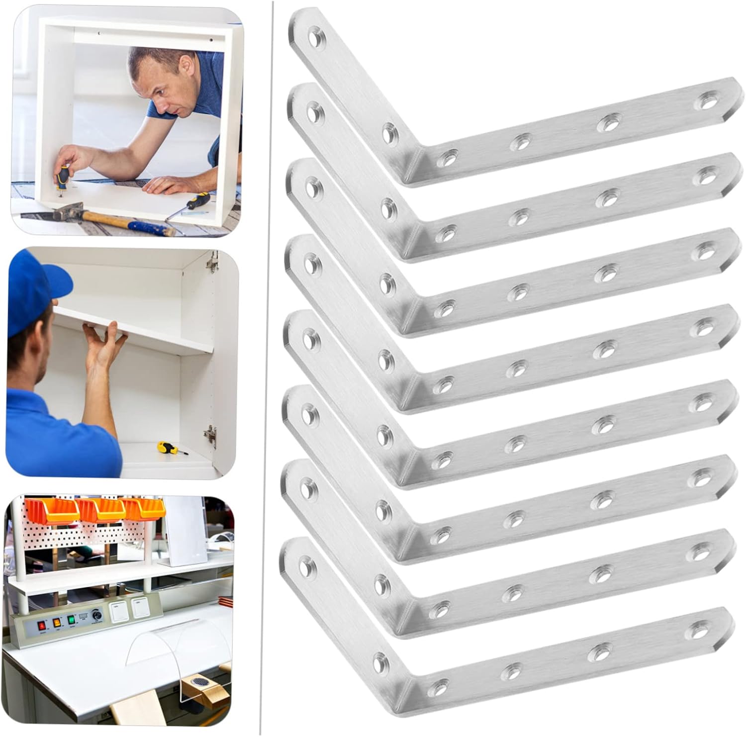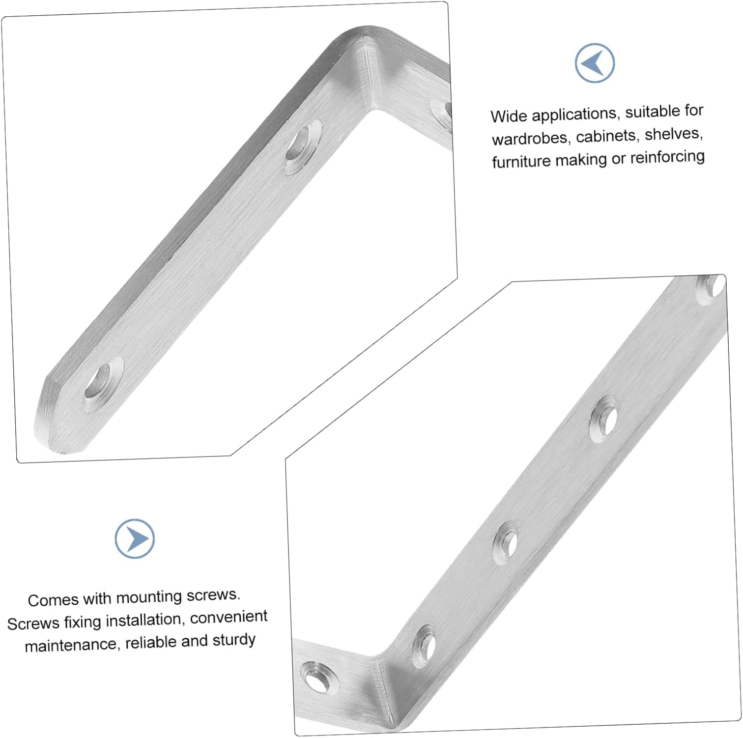 Package Include 10 x corner brackets screws small 20 x screws large 20 x expansion tubes Characteristics -Size:13.00X7.50X1.90cm/5.11X2.95X0.75in brackets for wood -Color:Silver shelf supports -Material:Stainless steel corner shelf bracket - Application range is wide, fit for storage rack, shoe rack, bookshelf and more angle bracket. - Wide , suitable for wardrobes, cabinets, shelves, furniture making or reinforcing angle brackets for wood. - The shape can reinforce the furnishings, reinforcing to keep furniture more stable shelf hanger. - Comes with mounting screws. Screws fixing installation, convenient maintenance, reliable and sturdy right angle bracket. - Made of stainless steel material, heavy duty, strong hardness, to break corner .Goods Descriptioncorner shelf bracket Made of heavy duty stainless steel, hard to fade and not east to , and do not deform easily, supporting a long time use.shelf mount Wide range of application, these L brackets are suitable for mounting closets, cabinets, chairs, display racks, etc