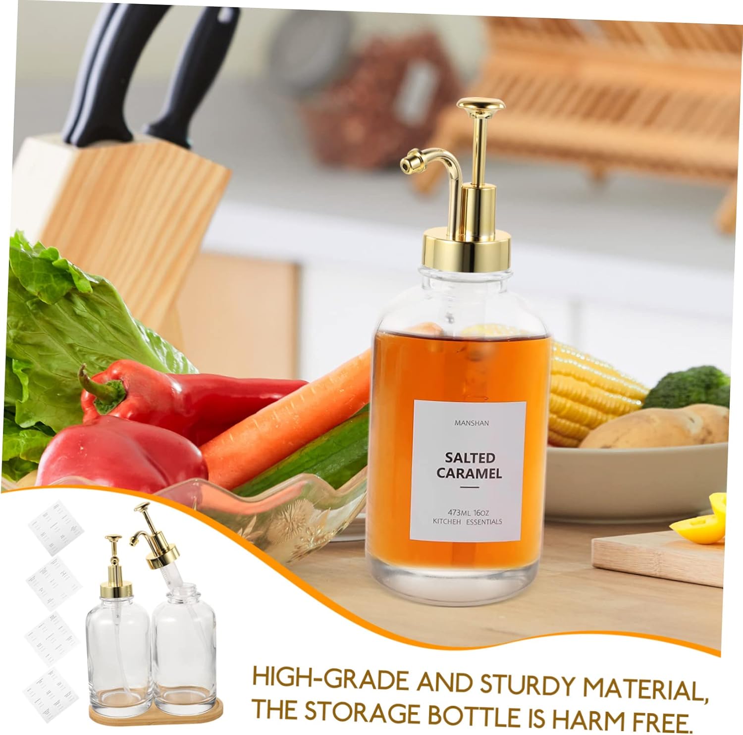 Package Include 2 x Syrup Dispensers 1 x Tray 1 x Sticker Features -Color:Golden glass syrup dispenser -Material:Glass, Wood simple syrup bottle -Size:23.00X7.50X7.50cm/9.04X2.95X2 coffee syrup dispenser with pump. -Compact and small, this honey dispenser is easy to store, not taking up any space coffee syrup bottles. -Transparent design of this syrup dispenser makes you can observe the rest clearly and easily glass syrup bottle. -It has a simple design, but very practical in use, bring much convenience to you coffee bar accessories. -The syrup dispenser is equipped with a pump lid to keep dirty items from the food inside coffee syrup dispenser. -The pump bottle is good for storing juice, and also can be used as a honey pot, and more simple syrup bottles.Goods Informationcoffee syrup with pump This transparent dispenser allows you to easily take out, which bring much convenience to your life.syrup for coffee The kitchen assistant for holding honey or syrup, and can be used for lotion and so on.coffee syrups This product is a pump bottle, adoption of and durable material