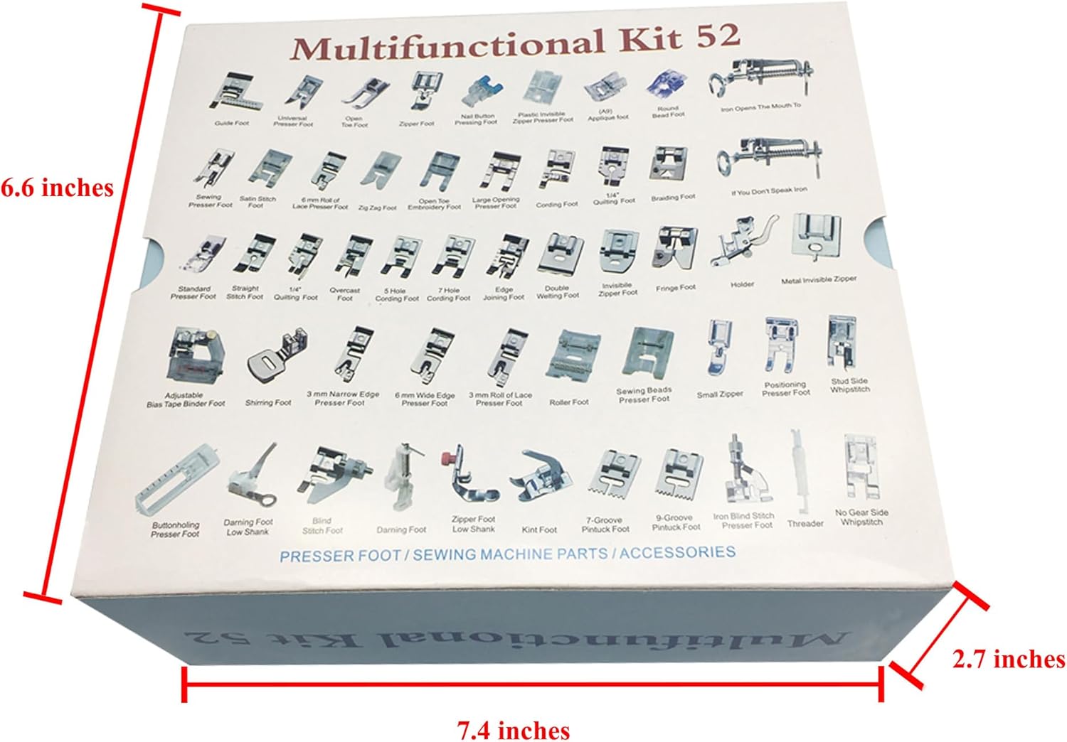 Package include: 1.Stitch Guide Foot; 2. Universal Presser Foot; 3. Open Toe Foot; 4. Zipper Foot; 5. Nail Button Pressing Foot; 6. Plastic Invisible Zipper Presser Foot; 7. (A9) Applique Foot; 8.Round Bead Foot. 9. Sewing Presser Foot; 10. Satin Stitch Foot; 11. 6 mm Roll of Lace Presser Foot; 12. Zig Zag Foot; 13. Open Toe Embroidery Foot; 14. Large Opening Presser Foot; 15. Cording Foot; 16. 1/4" Quilting Foot; 17.Braiding Foot 18. Standard Presser Foot; 19. Straight Stitch Foot; 20. 1/4" Quilting Foot; 21. Overcast Foot; 22. 5 Hole Cording Foot; 23. 7 Hole Cording Foot; 24. Edge Joining Foot; 25.Double Welting Foot; 26.Invisibile Zipper Foot; 27.Fringe Foot. 28. Adjustable Bias Tape Binder Foot; 29. Gathering foot/ Welting foot/ Shirring foot; 30. 3 mm Narrow Edge Presser Foot; 31. 6 mm Wide Edge Presser Foot; 32. 3 mm Roll of Lace Presser Foot; 33. Roller Foot; 34. Sewing Beads Presser Foot. 35. Buttonholing Presser Foot; 36. Darning Foot Low Shank; 37. Blind Stitch Foot; 38. Darning Foot; 39.Zipper Foot Low Shank; 40.Kint Foot; 41.7-Groove Pintuck Foot; 42.9-Groove Pintuck Foot 43.iron open presser foot 44.low shank iron open presser foot 45.metal invisible zipper 46.holder 47.small zipper 48.positioning presser foot 49.stud side whipstitch 50.iron blind stitch presser foot 51.threader 52.no gear side whipstitch