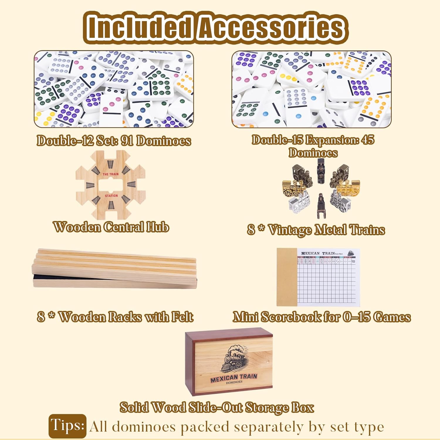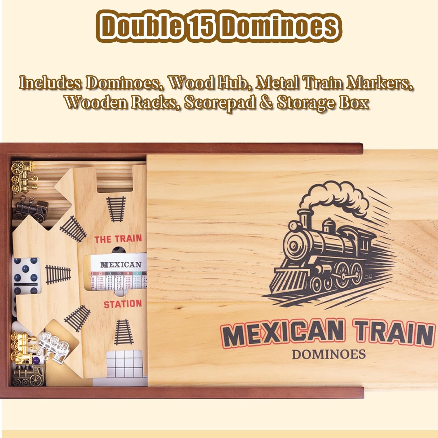 | Included Components | 136 Dominoes,8 Wooden Trays/Rcaks,8 Train Markers with Velvet Pouch,Wooden Central Hub,Scorepad,Wood Storage Box |