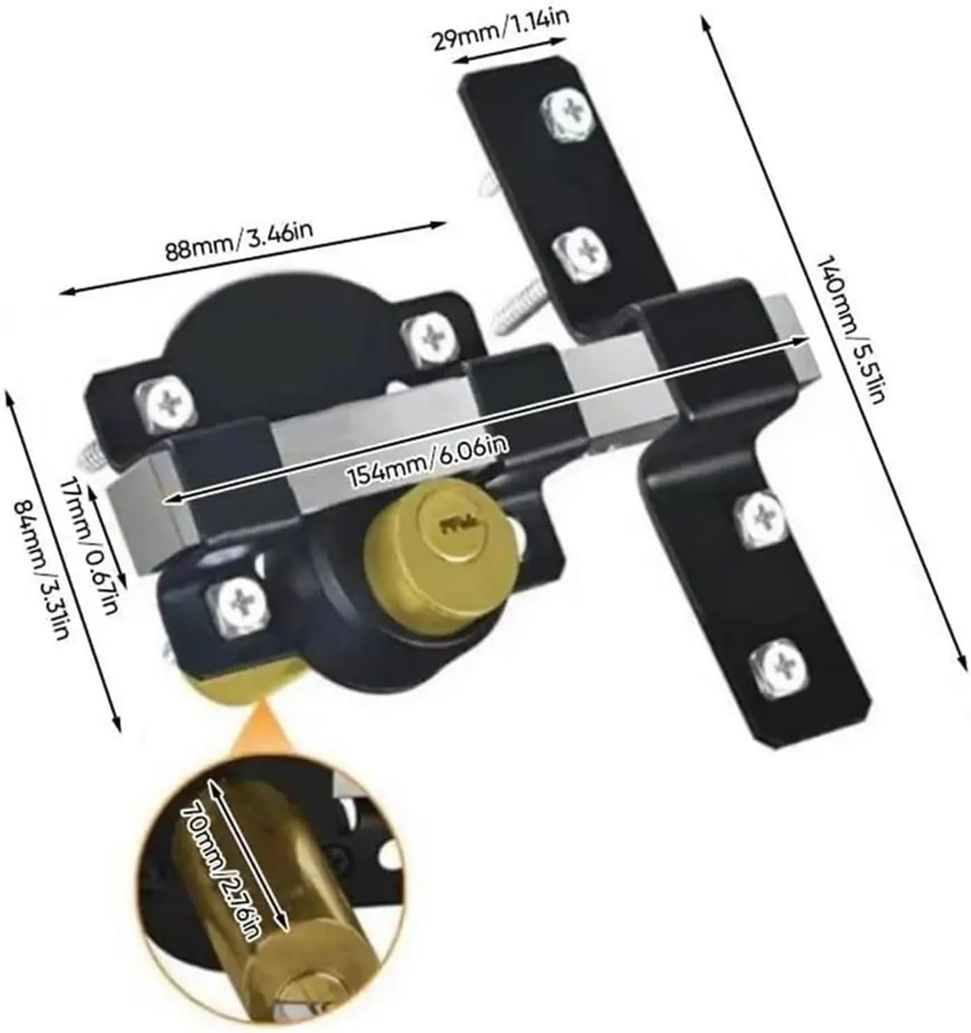 Specification:Material: IronProduct size: about 15.4x14cm/6.06x5.51 inchesCylinder length: about 7cm/2.76 inchesGross Weight: 1032gProduct List:1 Set * Barn Door Lock==========High-concerned chemical : None