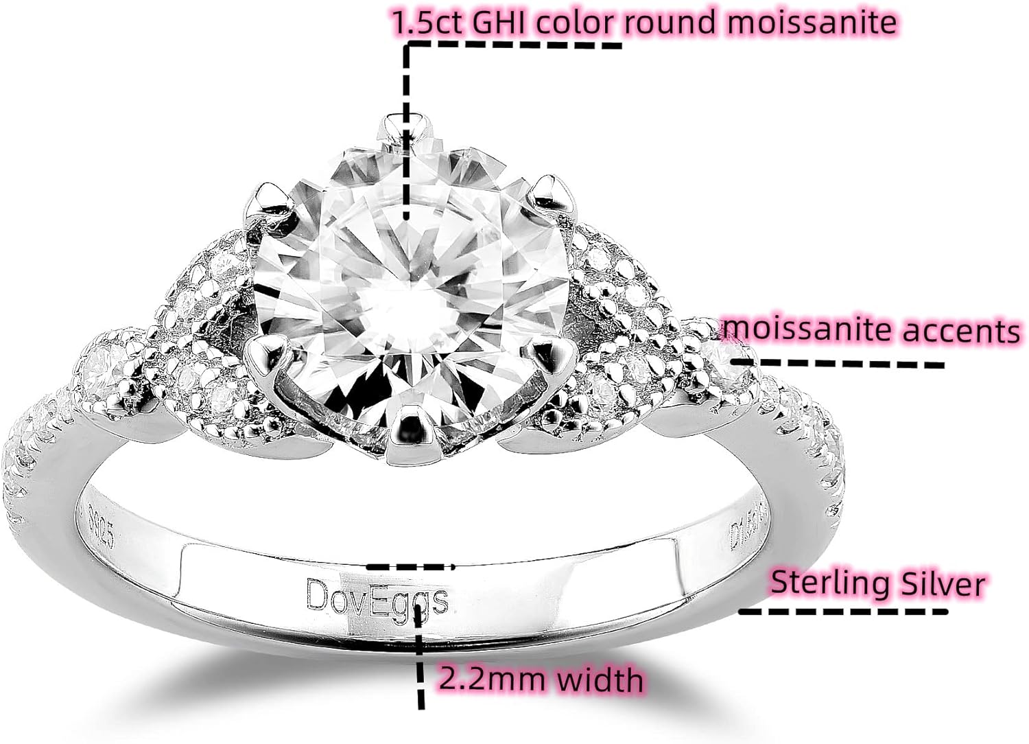 Item Type: Moissanite Wedding & Engagement Ring Surface Width: 5mm Main Stone: DovEggs Moissanite Engagement Ring Center Stone:1.5ct(7.5mm) F-G-H color moissanite Guarantee 1: Moissanite Test Positive by Thermal Diamond Testers Guarantee 2: Sterling silver Every jewelry comes with a warranty card as well as a beautiful gift box.