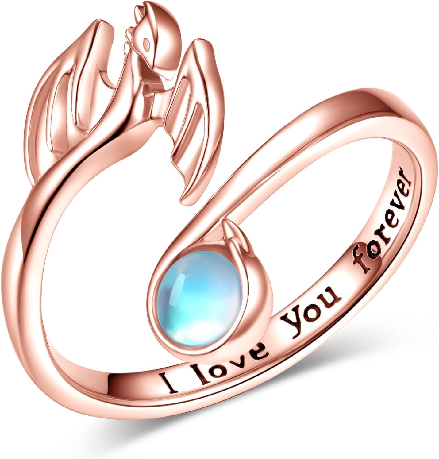 • Dragon Rings for Women: Dragon is a symbol of potent and guardianship in the old culture. Moonstone represents the love stone. The dragon ring features a delicate Dragon with a moonstone, which engraved "l love you forever", represents the guardianship of love, designed specifically for those who love dragon.