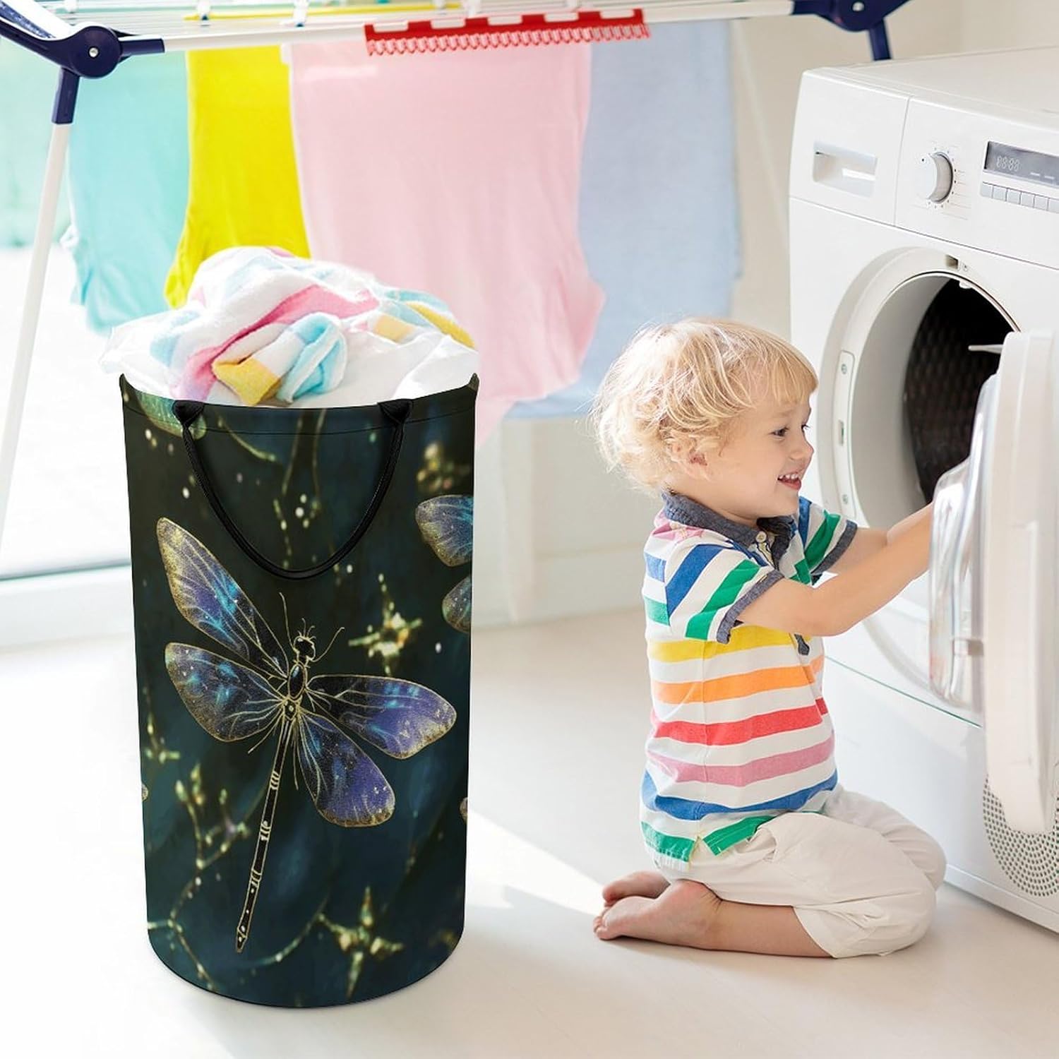 The pattern of the Dragonfly hamper is printed with exquisite patterns, which makes the product more attractive.Chic design allows it to be used in the living room to hold throw blanket, pillows, and reading materials, as well as in the bathroom for towels, or as a laundry hamper.The laundry hamper adopted collapsible design, equipped with handles. It is lightweight and portable for using, storing, and moving conveniently.Dragonfly Clothes hamper is suitable to store dirty clothes washing, place in the room to store toys, and other household goods, keep the house clean and tidy. Perfect laundry hamper for home, office, closet organizer, bedroom, bathroom, college dorm, etc.Gets out of your way when you need it to. This storage basket or laundry hamper is a good gift, which not only meets everyday storage needs but also carries deep care and love, a perfect way to turn thoughtfulness into warmth.