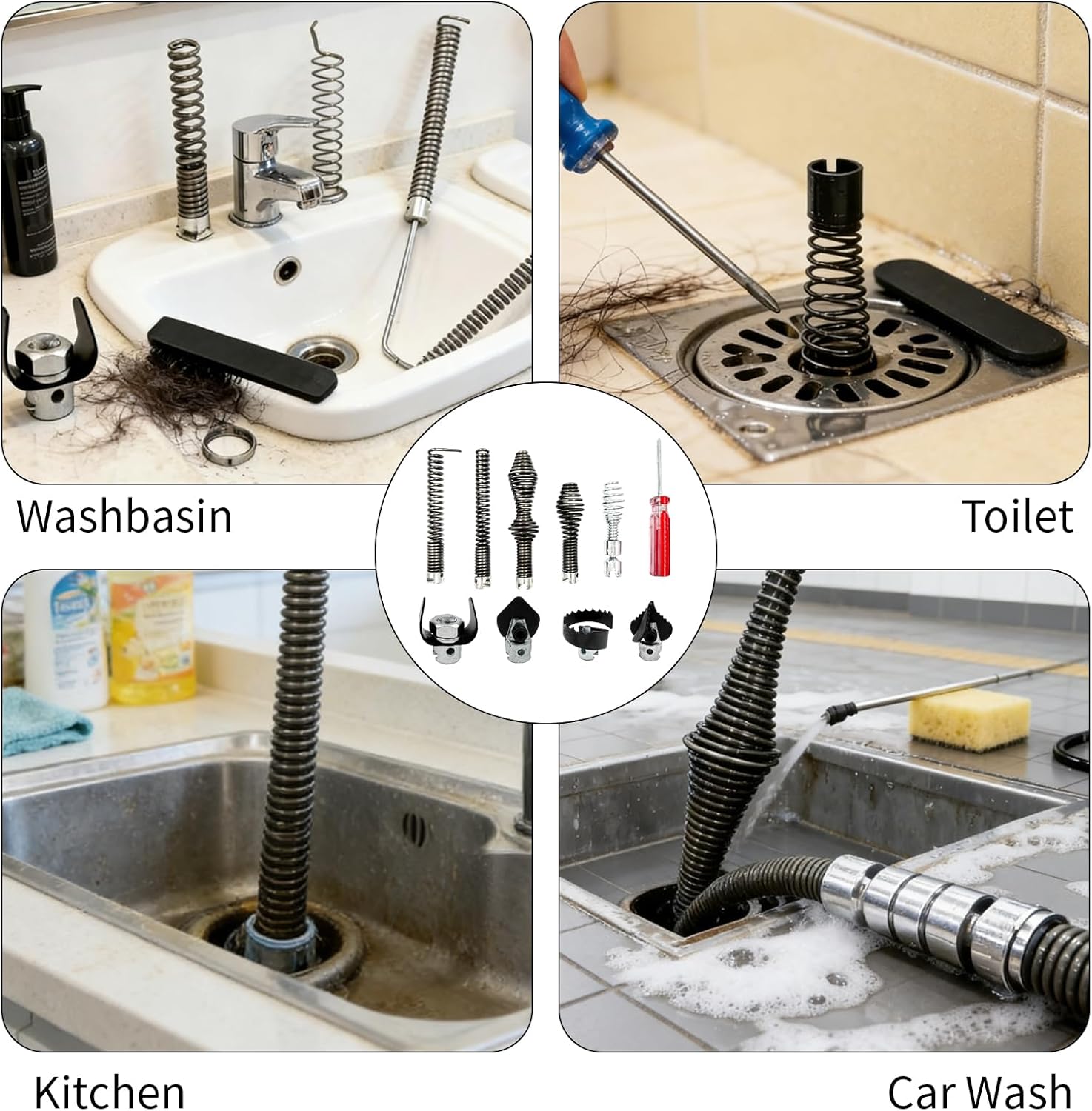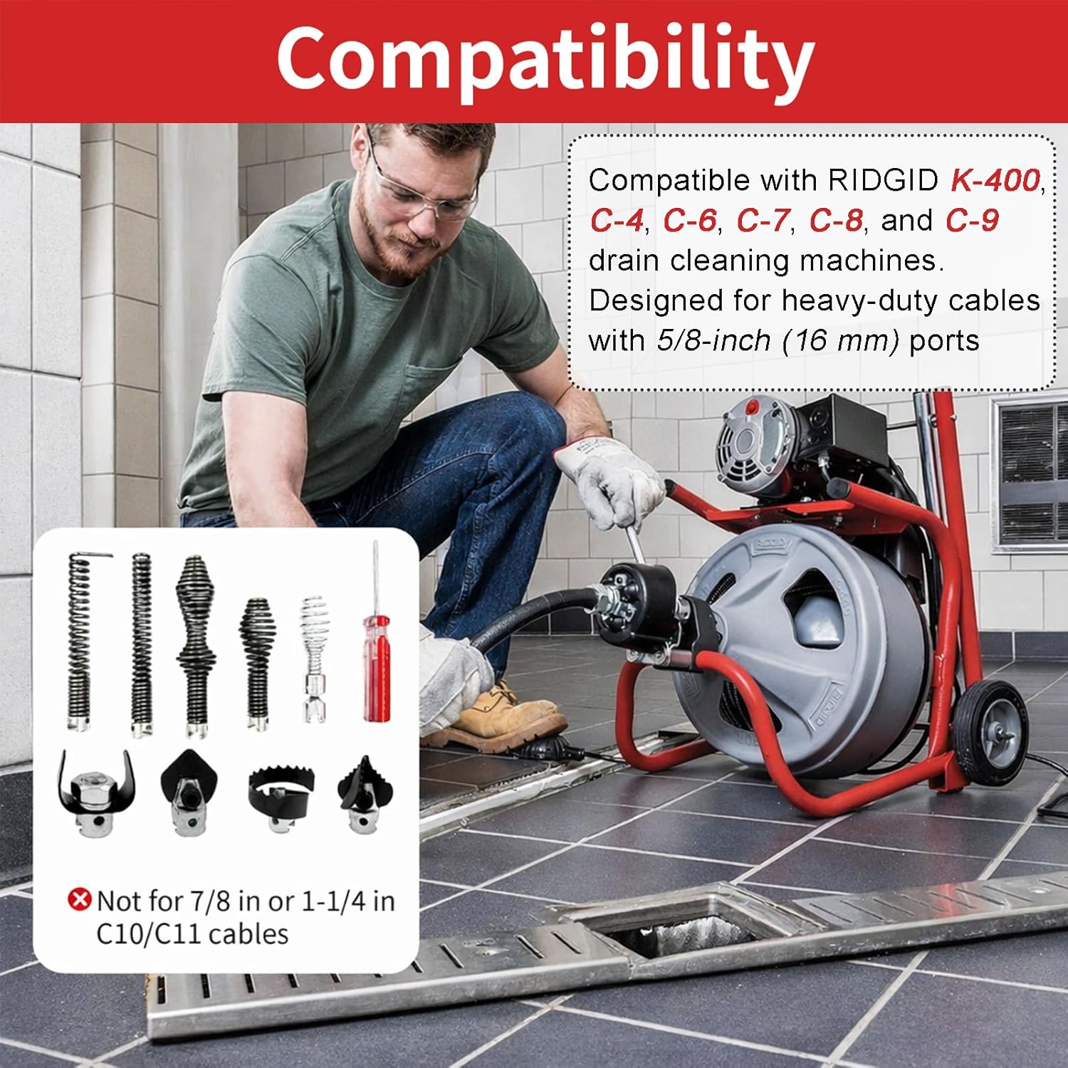 Specification Material: Carbon steel Product Type: Drain Auger Cutter Kit / Drain Snake Drill Attachment Compatibility: For RIDGID K-400, C-4, C-6, C-7, C-8, and C-9 drain cleaning machines Cable Size Fit: Compatible with 5/16", 3/8", and 5/8-inch (16 mm) drain cleaning cables (Not for 7/8" or 1-1/4" C10/C11 cables) Use: Ideal for clearing hair, grease, roots, and other stubborn drain clogs Application: Suitable for home or professional drain cleaning tasks Keep your drain cleaning jobs efficient and hassle-free with this 10-piece drain auger accessory, designed for RIDGID K-400, C-4, C-6, C-7, C-8, and C-9 Perfect for both DIY homeowners and professional plumbers, this drain snake clog remover set efficiently clears hair, grease, soap scum, and debris from sinks, tubs, and floor drains—keeping your plumbing system free-flowing and extending the life of your equipment. Package Contents: 4 × Special Cutting Tools, 5 × Augers, 1 × Screwdriver