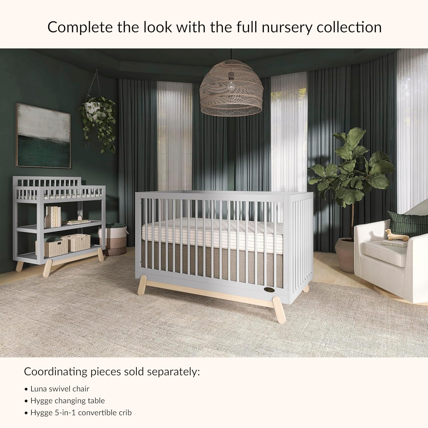 Creating a calm, organized space for diaper changes can make all the difference in your everyday routine. The Dream On Me Hygge Changing Table is thoughtfully designed to give both baby and parent a comfortable and secure experience. The elevated safety rails, water-resistant 1” changing pad, and secure safety belt help keep your little one safely in place, allowing you to focus on connection, soothing, and care. A wider changing surface offers room to move, making those daily diaper moments easier and more natural. Beneath the changing surface, you’ll find two spacious open storage shelves that keep all your essentials close at hand — diapers, wipes, lotions, washcloths, swaddles, and more. Whether you’re working with a roomy nursery or a small shared space, the Hygge helps keep things organized and flowing smoothly, so you never have to step away while tending to your baby. Crafted from durable New Zealand pine wood, this changing table offers lasting stability and a warm, inviting look. The Pebble Grey Oak finish blends beautifully with any nursery style and pairs perfectly with the Dream On Me Hygge Convertible Crib for a coordinated design. Smooth, easy-to-clean surfaces make daily upkeep simple and stress-free. Your baby’s safety and well-being always come first — which is why the Hygge is GREENGUARD Gold Certified, JPMA Certified, and meets or exceeds ASTM and CPSC safety standards. It’s also Baby Safety Alliance Verified and CPSIA compliant, with lead and phthalate levels well below federal limits, supporting cleaner indoor air and a protected nursery environment. Thoughtfully built to last and backed by a 1-year limited warranty, the Hygge Changing Table offers comfort, peace of mind, and modern functionality from the newborn stage and beyond. Dimensions: 34.8" L x 19.25” W x 41” H.
