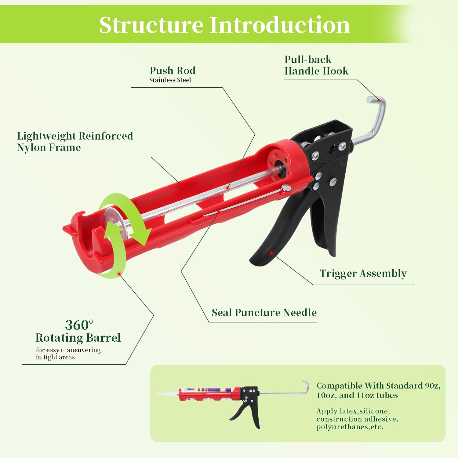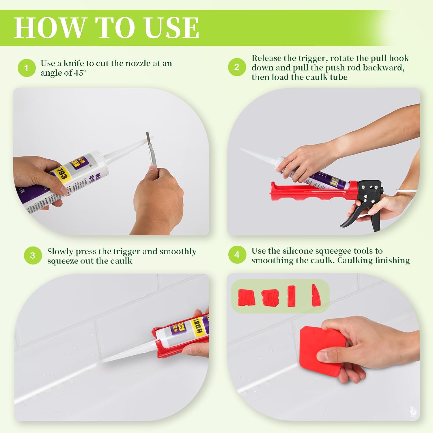• Easy to Operate. First, release the trigger, rotate the pull hook down and pull the push rod backward, then load the caulk tube. Second, slowly press the trigger and smoothly squeeze out the caulk. Last step, caulking finishing with silicone profiling tools.