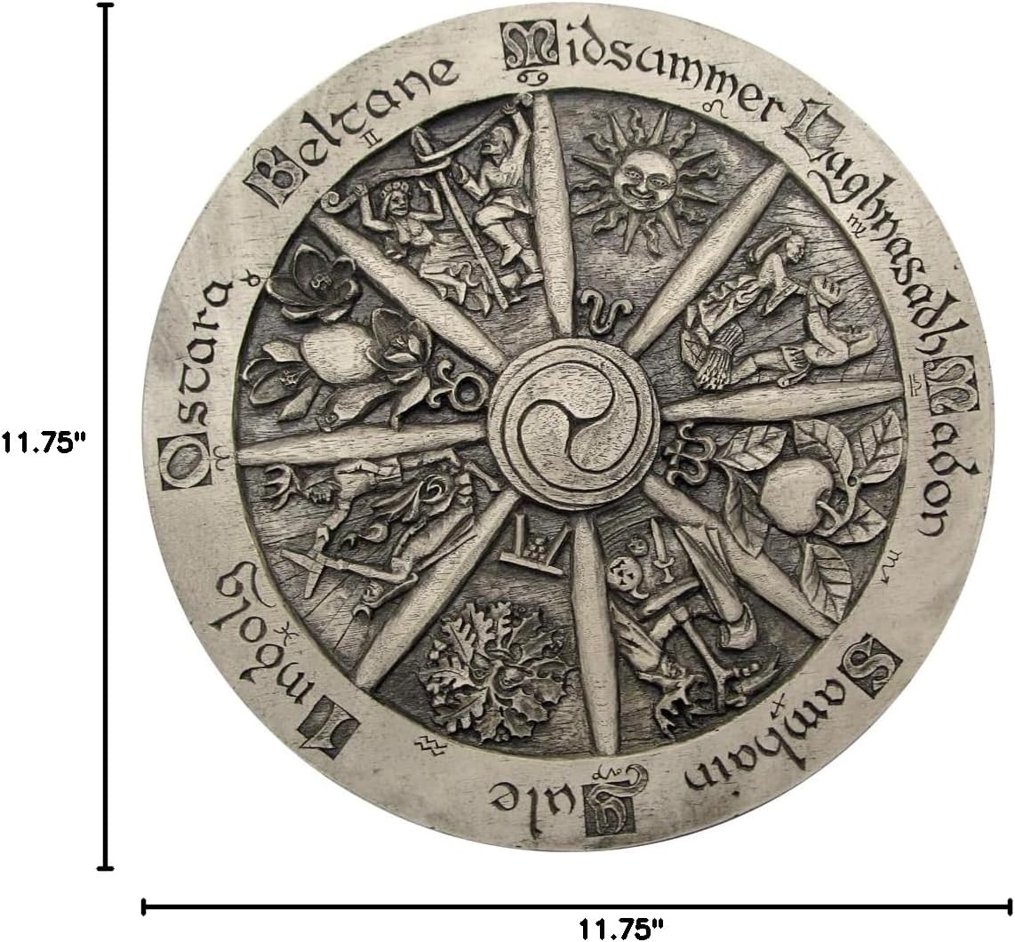 Celebrate the Earth's rhythm and connect with the Wiccan cycle with this beautiful Wheel of the Year Plaque! This large 11.5-inch plaque depicts the eight Sabbats, or Pagan holidays, throughout the year. Each section features symbolic imagery representing the changing seasons, from the vibrant summer of Litha to the introspective darkness of Samhain. Alchemical symbols and the four tools of Wicca highlight the deeper meanings of the holidays, while the zodiac signs woven throughout illustrate the celestial connection. Crafted from high-quality resin with a beautiful stone finish, this Wheel of the Year Plaque makes a stunning addition to any Wiccan or Pagan home decor and serves as a constant reminder of the cyclical nature of life.