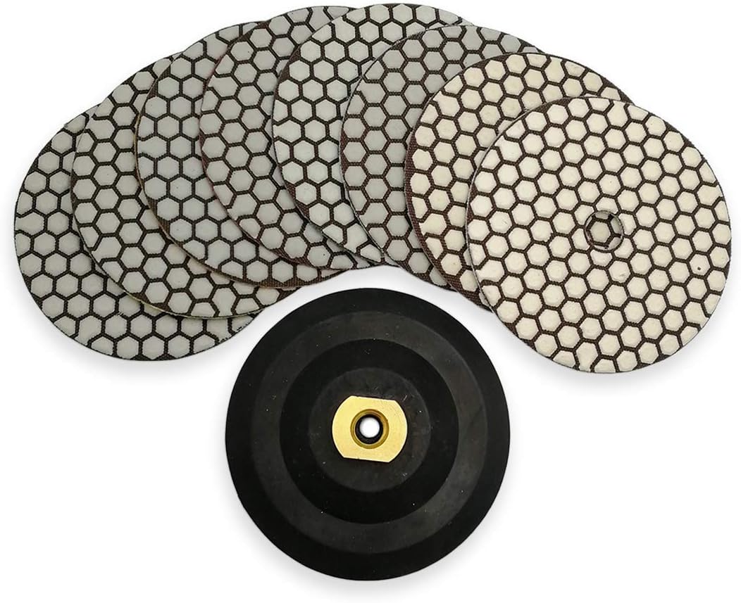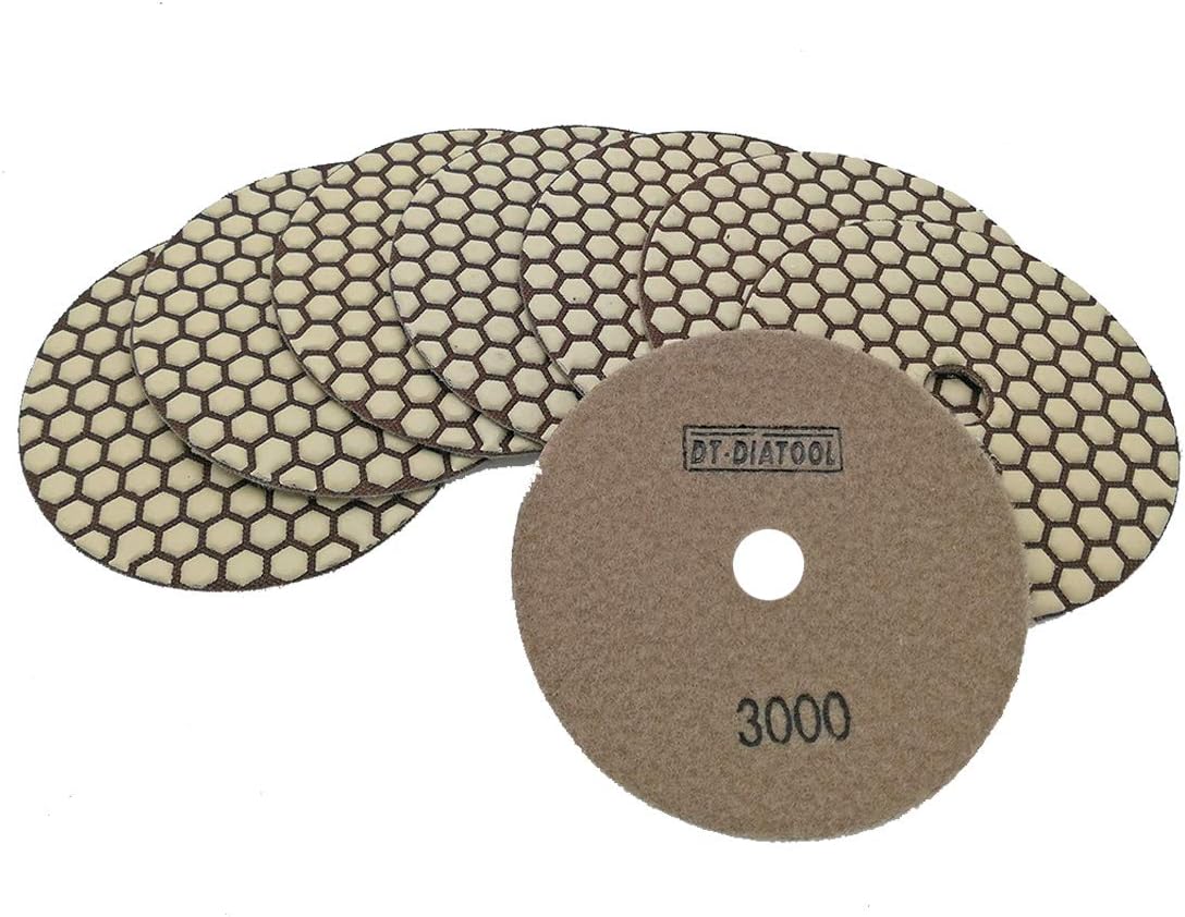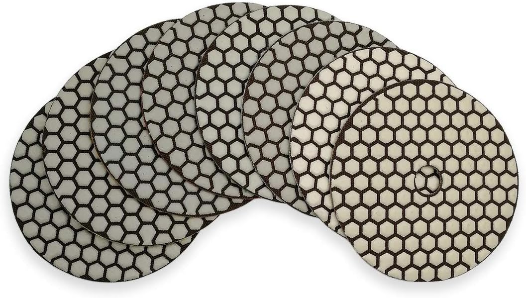 ---------------------Description------------------------------- Product Name:DT-DIATOOL 8pcs 5 Inch Diamond Dry flexible polishing pads Specification:Diameter 125mm/5inches, thickness 1.5mm, Available Grit: 50#,100#,200#,400#,800#,1500#,3000#,WBUFF Quantity: 8pcs 125mm and an aluminum Backer Feature: Recommended speed is 2500RPM, Max capacity is 5000RPM Flexible, suitable for different shape polishing Dry polishing, working without water, convenient and less pollution =======The End======= Other availabe grit: 50#,100#,200#,400#,800#,1500#,3000#,WBUFF