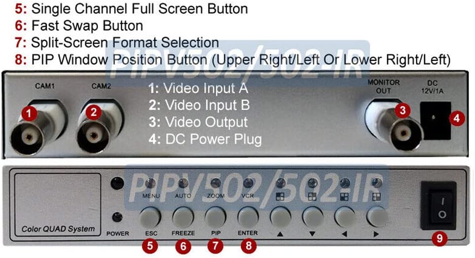 2-Channel Picture-In-Picture BNC Video Mixer With IR Remote This low-cost PIP video generator provides users with 2 video feeds displayed on one screen for monitoring/recording purpose. The Picture-In-Picture split screen style and PIP position can be controlled by using the supplied IR remote controller or push buttons on the front panel. Dual-Channel Frame Synchronizer This PIP screen processor system is a real-time dual-channel frame synchronizer. Both mixed video inputs are synchronized accurately and displayed simultaneously for smooth and sharp pictures. 2-Channel Split Screen Display Both video input channels can be presented in the following 13 matrix screen modes:Single-channel full screenPIP window screen on upper-left cornerPIP window screen on upper-right cornerPIP window screen on lower-left cornerPIP window screen on lower-right cornerHorizontal equal-split screen with top/bottom video windowsVertical equal-split screen with left/right video windowsPicture-by-picture screenQuad screen windowFast Swap Between Main/PIP Channel Main video screen and PIP screen can be exchanged instantly by simply pressing the swap button on the front panel or IR remote. This hotkey function is designed to provide fast switching between the main channel and the sub video channel.IR Remote Control This PIP video controller can also be controlled via using the supplied IR remote for ease of operation at distance.Last Memory The last-minute PIP screen mode will be displayed right away after power cycling or power outage.Daisy Chain Setup This PIP generator can be used standalone or cascaded together to process more video inputs or combined with other mixers or A/V switches.
