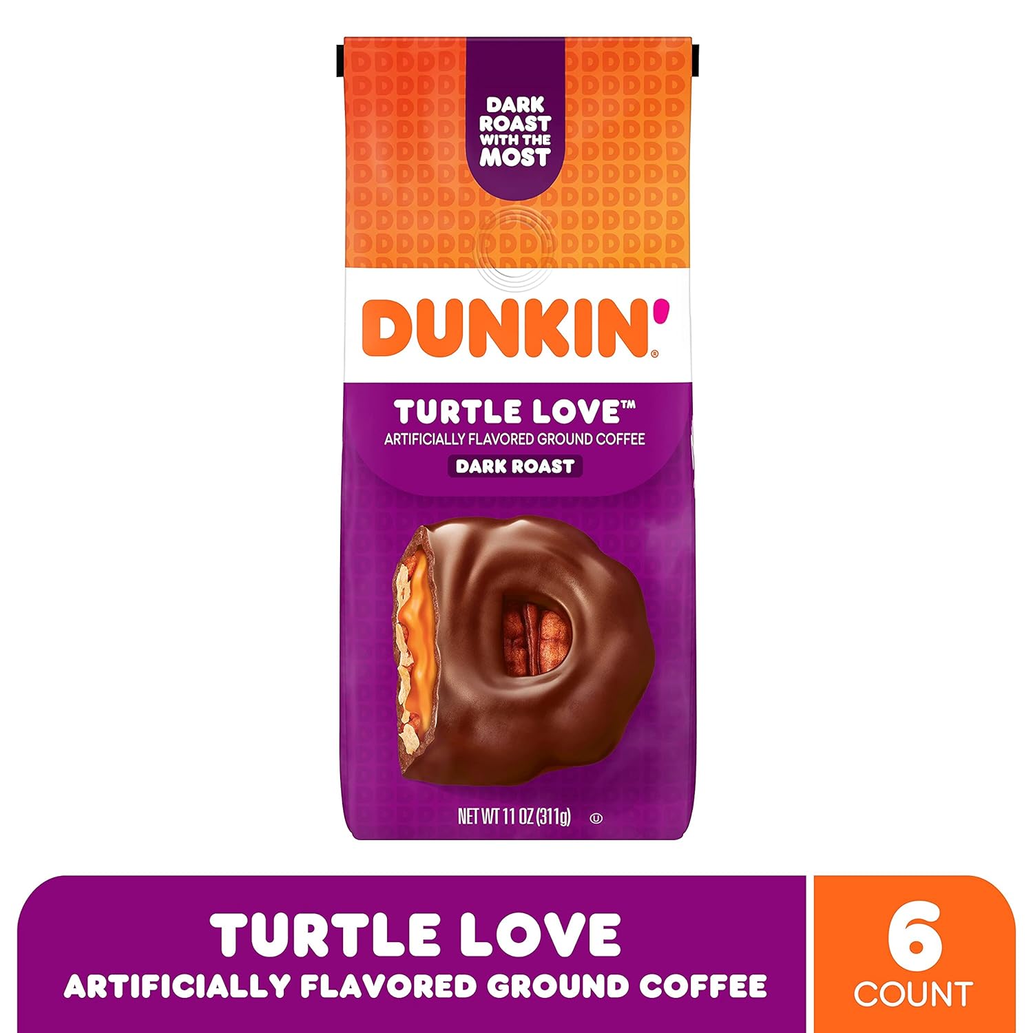 Have you ever felt love at first sight with a cup of coffee? If not, you’ve obviously never had Dunkin’ Turtle Love artificially flavored coffee in your mug. Swirling with notes of creamy caramel, buttery pecan and smooth dark chocolate flavors, Turtle Love flavored coffee is a dark roast that will have you head over heels at first sip. And its ground coffee form makes it easy to brew by the cup or the pot with any coffee maker—perfect for enjoying the great taste of Dunkin’ coffee right in your kitchen. It’s a flavor that’s sure to love you back.