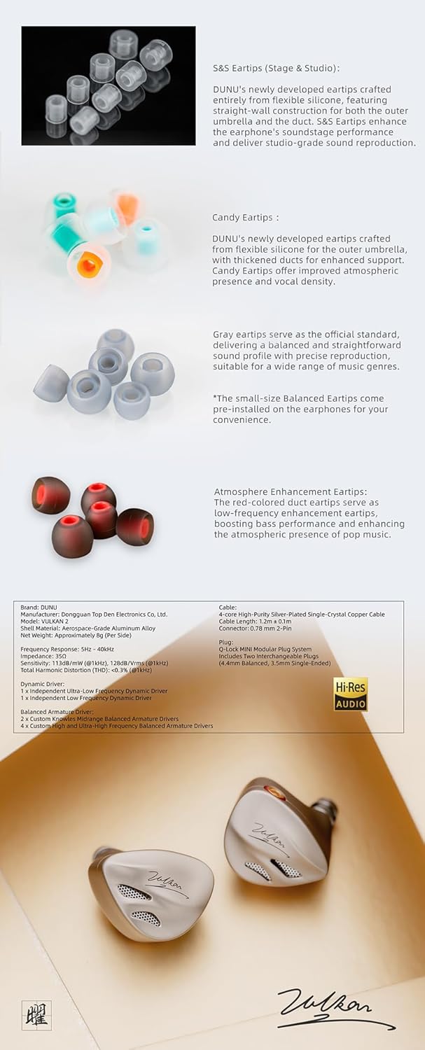 Model: VULKAN 2 Shell Material: Aerospace-Grade Aluminum Alloy Net Weight: Approximately 8g (Per Side) Frequency Response:5Hz-40kHz Impedance:35Ω Sensitivity:113dB/mW(@1kHz).128dB/Vrms(@1kHz) Total Harmonic Distortion (THD): <0.3%(@1kHz) Dynamic Driver: 1 xIndependent Uitra-Low Frequency Dynamic Driver 1 xindependent Low Frequency Dynamic Driver Balanced Armature Driver: 2 x Custom Knowles Midrange Balanced Armature Drivers 4 x Custom High and Ultra-High Frequency Balanced Armature Drivers Cable: 4-core High-Purity Silver-Plated Single-Crystal Copper Cable Cable Length: 1.2m ±0.1m Connector:0.78mm2-Pin Plug: Q-Lock MINl Modular Plug System includes Two interchangeable Plugs (4.4mm Balanced,3.5mm Single-Ended)