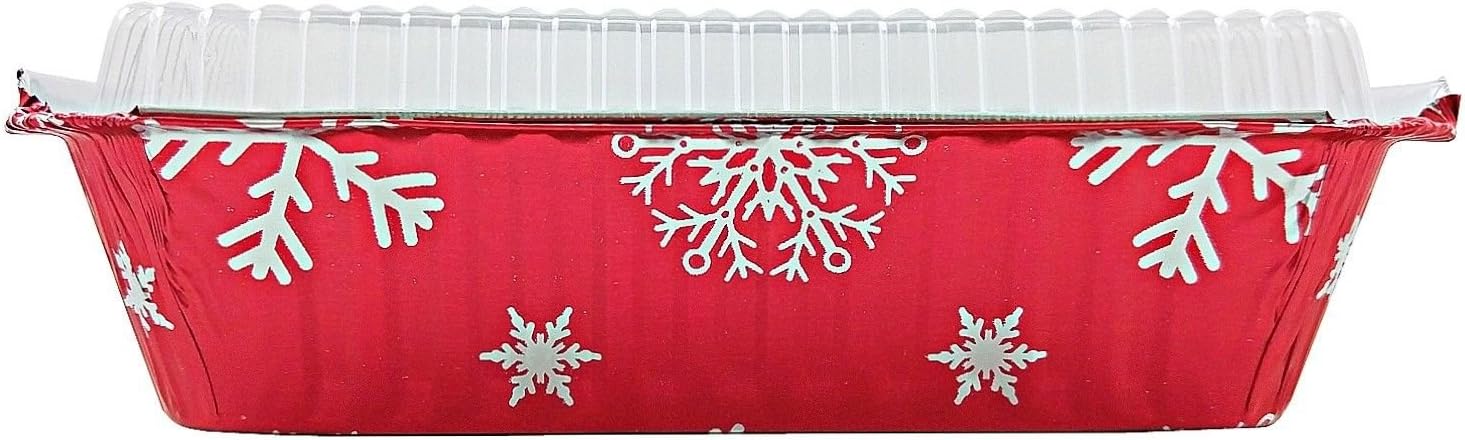 PREMIUM QUALITY 2 1/4 LB OBLONG HOLIDAY FOIL PAN w/CLEAR PLASTIC DOME LID 25 PAIRS PRODUCT FEATURES: Foil Pan Dimensions: 8-7/16" L x 5-15/16" W x 1-13/16" H. Dome Lid Dimensions: 8" W x 6" L x 13/16" H. Capacity: 36.1 Fl. Oz. Sturdy Pans, Made with Heavy 30 Gauge Aluminum Foil. Brilliant Red/Gold (or Red/Silver) Christmas/Holiday Design on Outside, Silver Aluminum Inside. 25 Foil Loaf Pans with 25 Matching Clear Plastic Dome Lids. Ideal Pans For Cakes, Pastries, Sweets, Take-Out, and More. OU Kosher Certified, Made in Wheeling, IL USA.