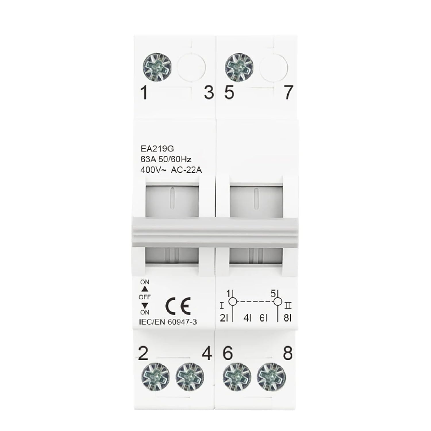 The EA219G 2P Manual Transfer Switch is an essential component for electrical systems requiring reliable dual power source management. This compact modular device is designed for seamless DIN rail mounting, making installation straightforward in control panels and distribution boards. With a robust 63A rated current capacity and 400V AC voltage rating, this transfer switch handles demanding electrical loads with confidence. Operating at both 50Hz and 60Hz frequencies, it offers versatile compatibility for various commercial and industrial applications. The manual operation provides direct control over power source selection, allowing operators to switch between primary and backup power supplies as needed. Built to last, this switch features an impressive mechanical life of 8500 operations and an electrical life of 1500 cycles, ensuring long-term reliability in critical power management scenarios. The IP20 protection degree safeguards internal components from solid objects, while the compact dimensions of 3.27 inches in height and 1.42 inches in width optimize panel space. Certified to CE standards and compliant with IEC/EN 60947-3, this 2-pole isolating disconnect switch operates reliably in ambient temperatures ranging from -5°C to 40°C, making it suitable for diverse environmental conditions.