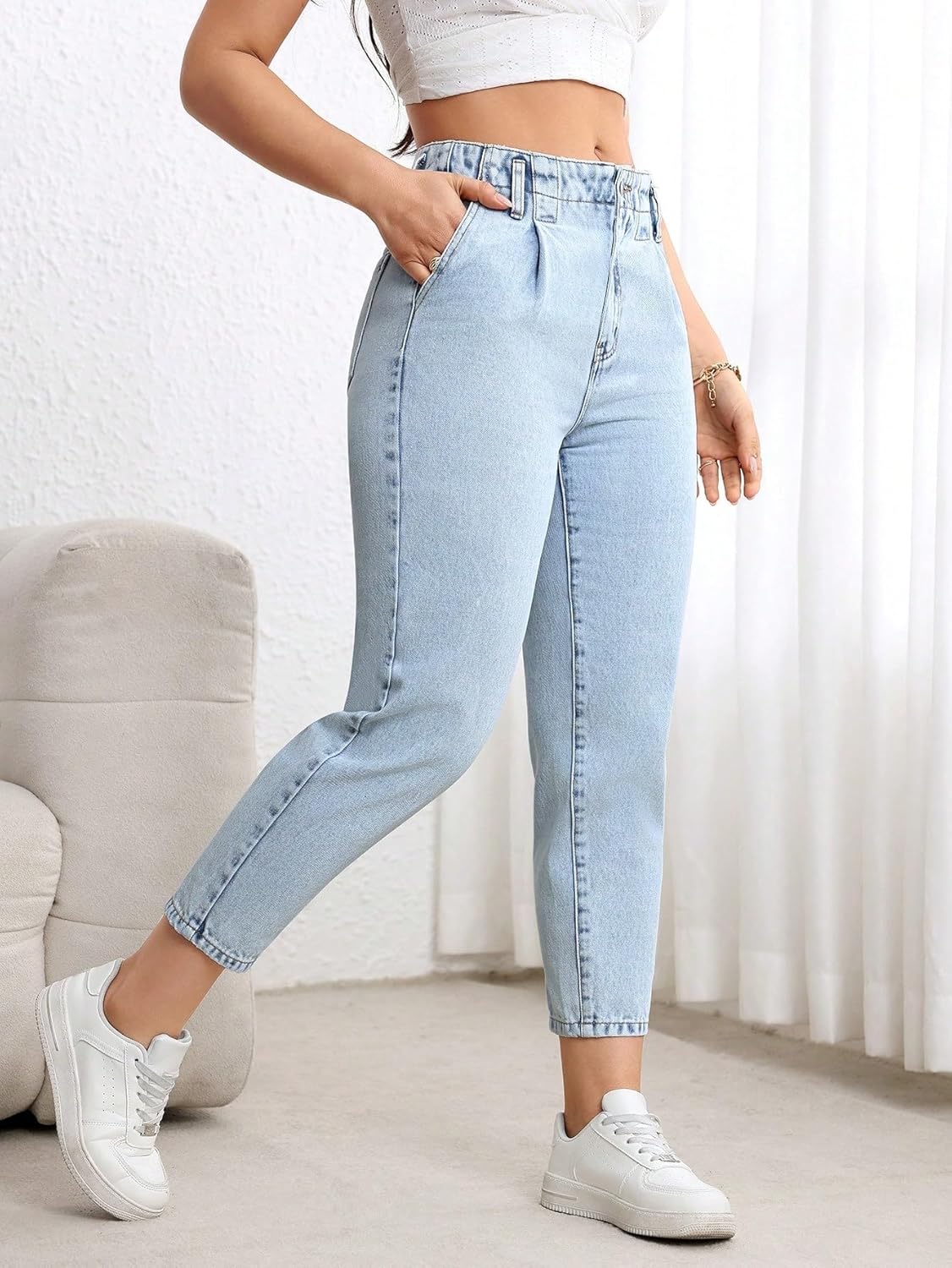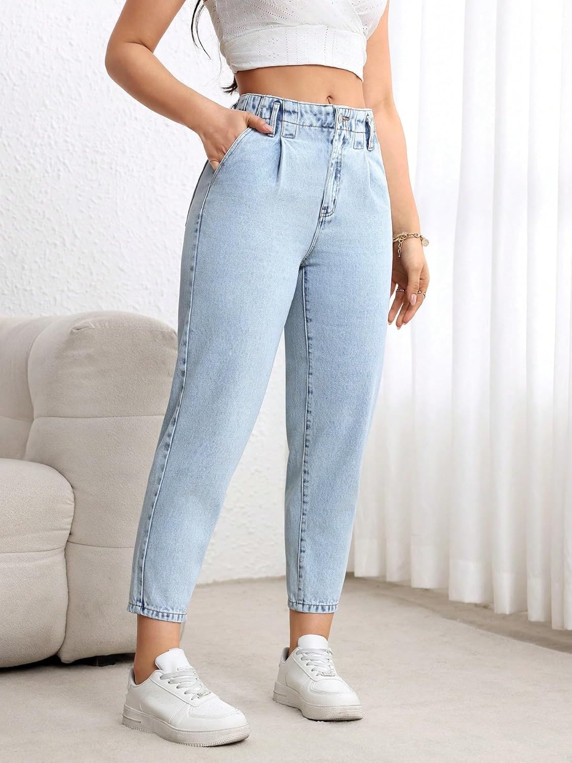 Elevate your daily style with our women's versatile jeans, crafted for uncompromising comfort and timeless elegance. The premium cotton-blend denim with spandex offers a luxurious, stretchy feel, ensuring a snug yet free fit. Breathable and skin-friendly, it’s perfect for all-day wear, whether running errands, meeting friends or exploring the city. Stylish and functional, the flattering mid-rise waist subtly cinches for a slimming effect. The straight-leg (or cropped) silhouette elongates legs, while the minimalist design stays trendy. Reinforced stitching boosts durability, and the classic five-pocket design adds practicality. Smooth zipper and sturdy buttons ensure a secure fit for all-day confidence. Highly versatile, it transitions seamlessly from casual to semi-formal occasions. Pair with a graphic tee and sneakers for weekends, or a blazer and loafers for the office. Suitable for year-round wear—matching tank tops in summer and sweaters in winter. The high-quality fabric resists fading and wear, maintaining a new look after repeated use.