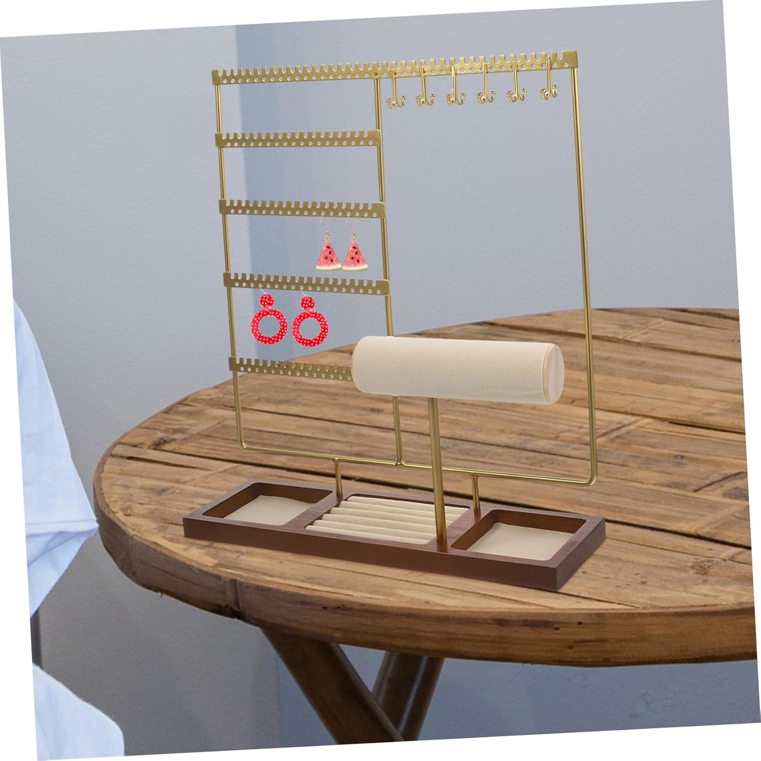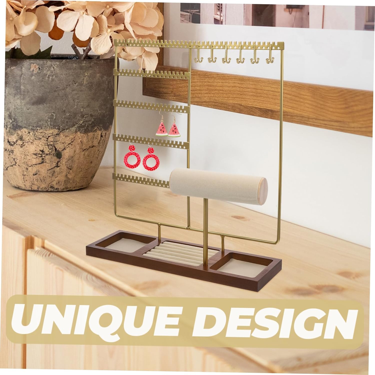 Package List 1 x jewelry display rack Characteristics - Color: Golden Jewelry Hanger -Material:Wooden, iron, int Earring Display Stand - Size: 35.00X30.00X9.50cm/13.76X11.79X3.73in Jewelry Holder -With multi-tier design, the jewelry storage stand can hold your necklaces, bracelets, dangle earrings, earring Necklace Display Rack. -Made from sturdy and stable iron material to ensure long-lasting use Sleek and modern, adds elegant style Ear Pendant Holders. -Versatile design allows for easy organization of earrings, necklace, ring, bracelets, and more, can widely use. Jewelry Storage Stand -Made of iron and wood materials, the jewelry organizer stand is and strong, not easy to break or deform Earrings Necklace Holder. -Space-saving design of this jewelry display stand with a large capacity for storing various types of jewelry Jewelry Stand.Goods InformationJewelry Display iron material ensures that it will last for years to come.Home Supplies This jewelry display stand is for those who want to save space while still having a large capacity for their jewelry.Jewelry multi-layered design allows for easily storage of multiple types of jewelry, making it a great addition to any bedroom or dressing room
