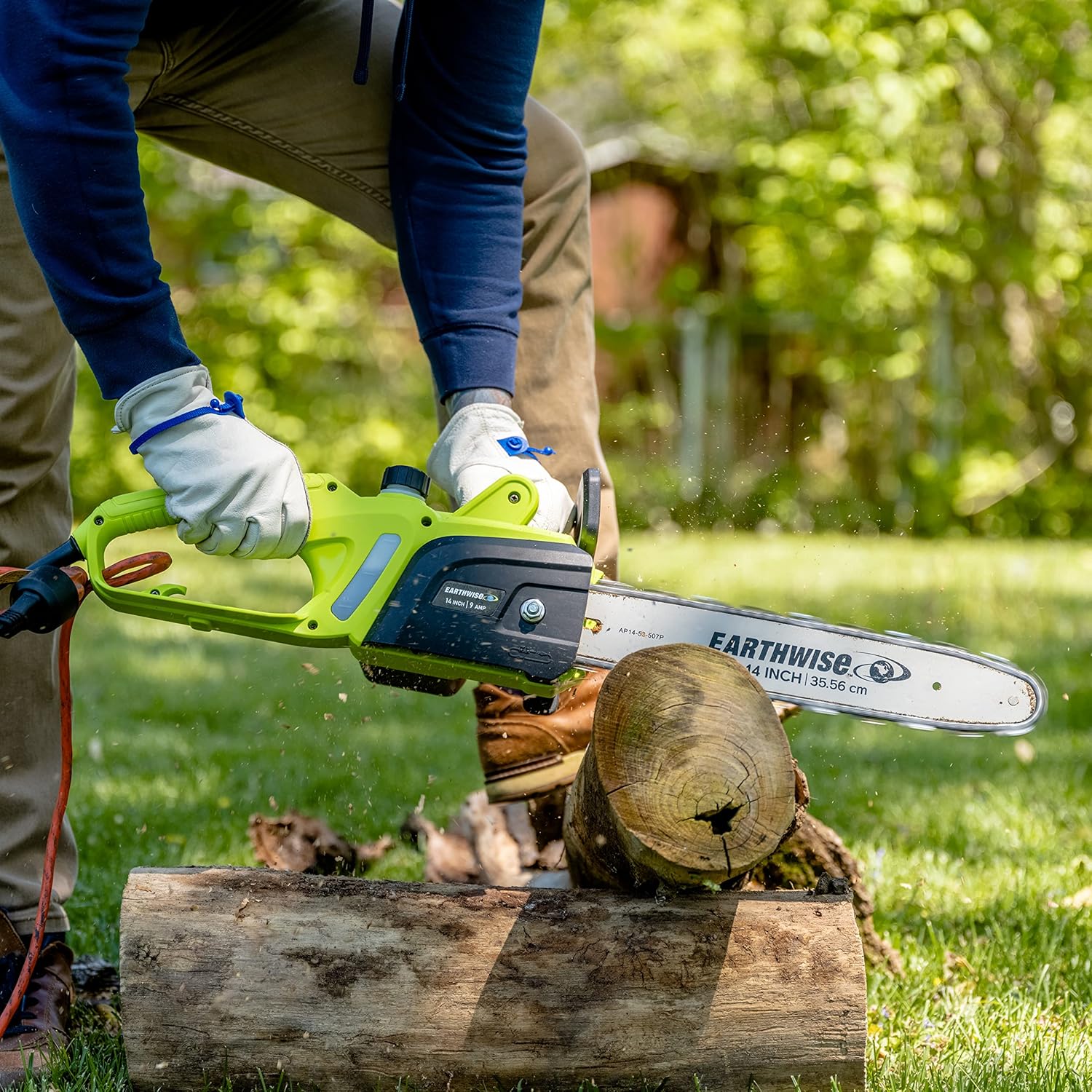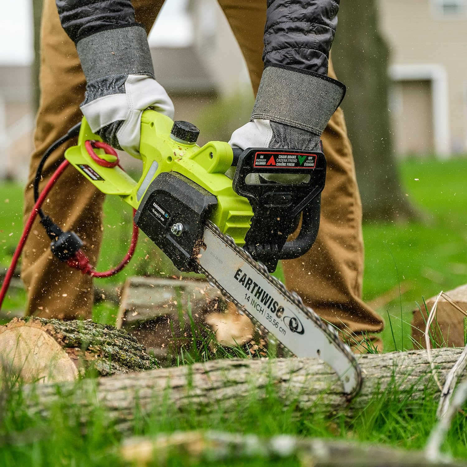 • Electric chainsaw with a 14-inch bar and chain, powerful 9-Amp motor, and chain brake
