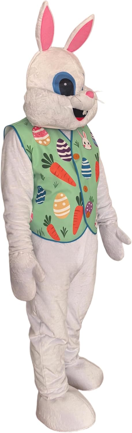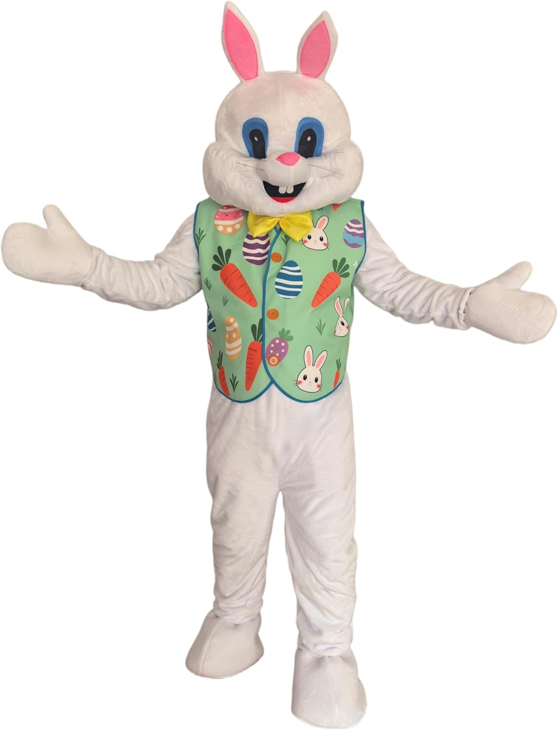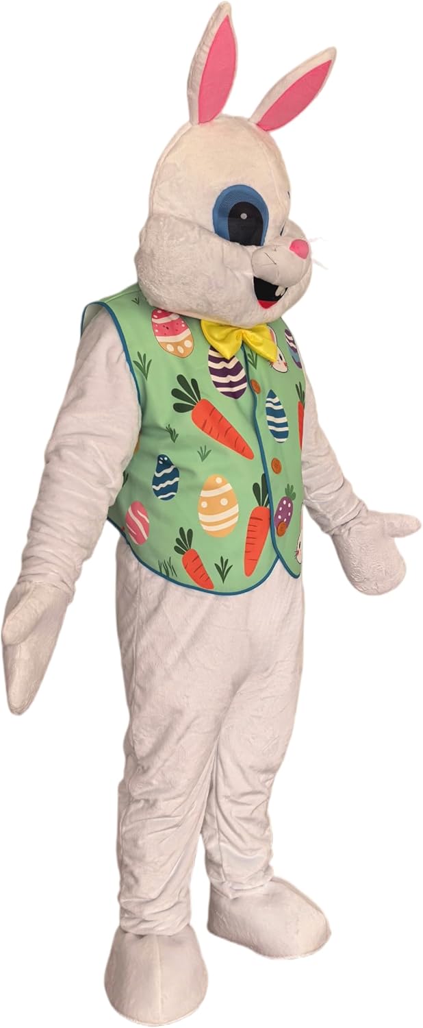 Bring the magic of Easter to life with this delightful full-body bunny mascot costume! The plush white suit features an adorable character head with pink ears, bright blue eyes, and a cheerful expression complete with signature bunny teeth. The costume's standout feature is its charming mint green vest decorated with a festive Easter pattern of colorful eggs, playful bunnies, and fresh carrots. A dapper yellow bow tie adds an extra touch of personality. Perfect for Easter celebrations, spring festivals, or community events, this professional-quality mascot costume includes everything needed to transform into a lovable Easter Bunny. The full-body design ensures complete coverage, while the plush material provides comfort for extended wear. The detailed headpiece captures the classic Easter Bunny look that everybody know and love. Whether hosting an egg hunt, taking photos at a mall, or spreading joy at community gatherings, this mascot costume creates memorable experiences for everydoby.