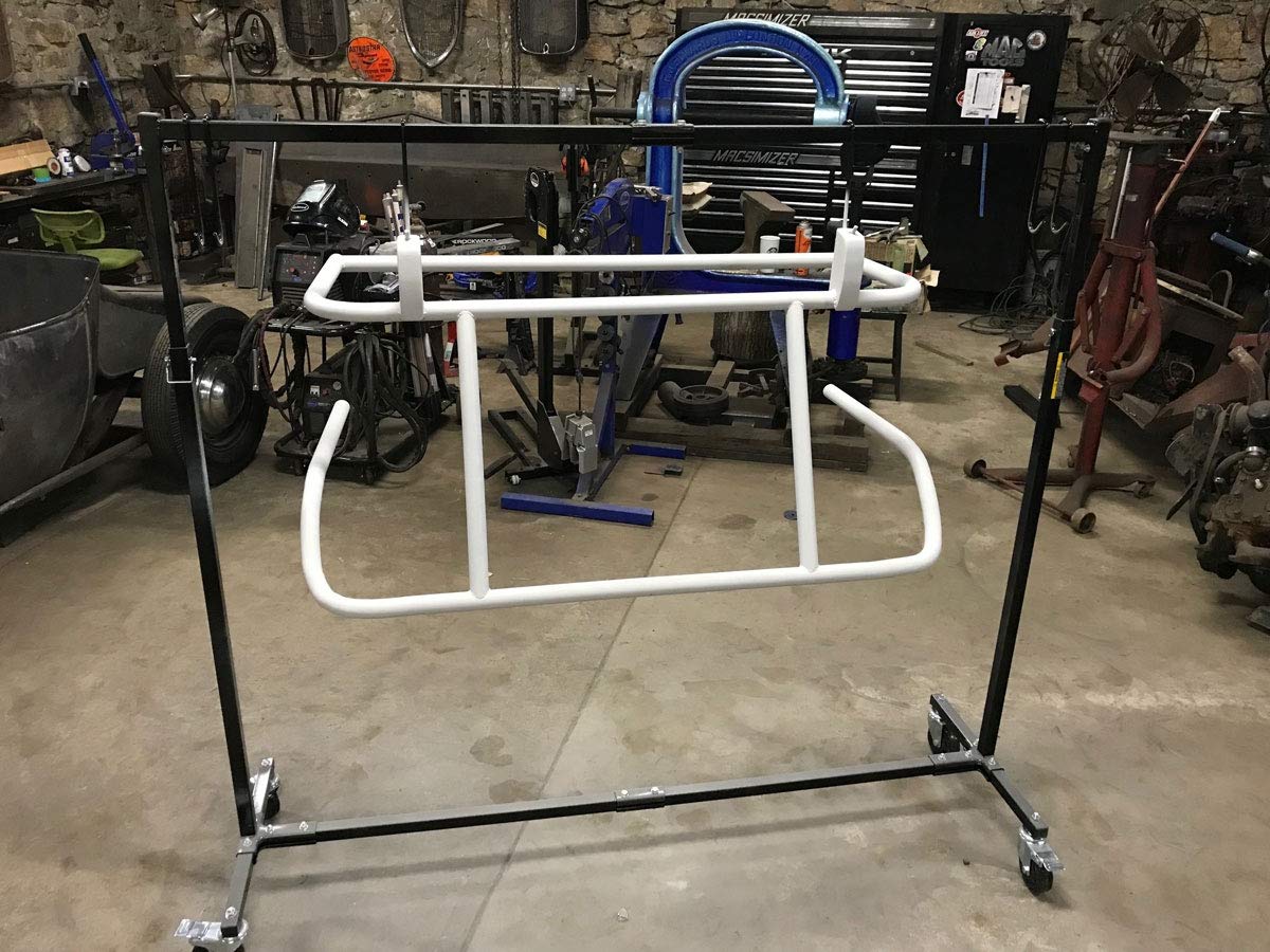 A favorite of professional body shops and hobbyists alike, the Eastwood Portable Painting Rack features heavy-duty powder-coated steel tubing with a total weight capacity of 320 lbs.Quick, easy, and convenient to useAn adjustable frame that extends from 5' to 80 inches (6.6Ft) Six Hooks to hold parts for painting or dryingDurable powder-coated finishThe 70" wide rack also adjusts in height from 5 feet to 80 inches (6.6Ft) making this perfect for hanging doors and hoods. Equipped with polyurethane casters, two swivels and two are locking to secure the rack where you need it while you work.An adjustable frame that extends from 5ft to 80 inches (6.6Ft)6 Hooks to hold parts for painting/drying4" Poly Urethane caster wheels, 2 swivels, 2 swivels with brakeSteel Tubing, Powder Coated320lb Capacity total110lb Capacity per hookWeight: 37 lbs.