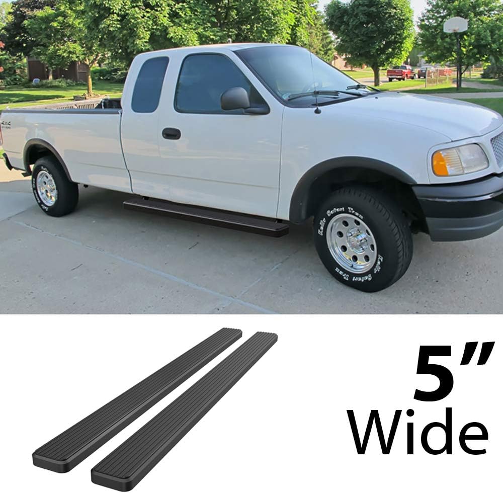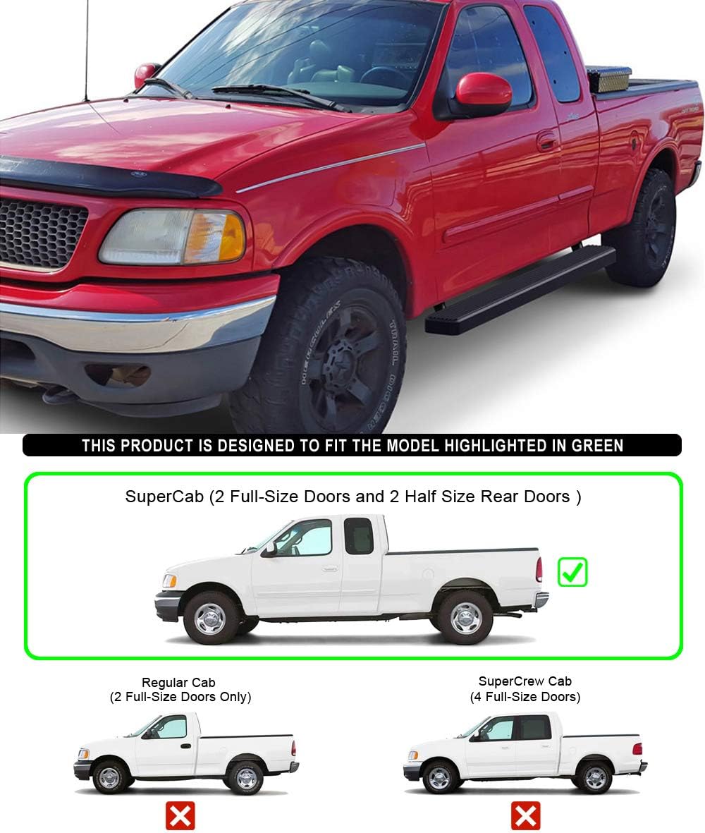 FitmentsCompatible with F-250 1999-2003 Extended Cab Pickup 4-Door (Incl. 04 Heritage Model)Compatible with F-150 1999-2003 Extended Cab Pickup 4-Door (Incl. 04 Heritage Model)Compatible with F-150 1999-2003 Heritage Extended Cab Pickup 4-Door (Incl. 04 Heritage Model)IntroductioneBoard running boards fit good and look good on your truck. These custom fit running boards have a simple, clean design that put bulky and over styled nerf bars to shame. The eBoard's lightweight yet durable aluminum frame supports up to 500 lbs without bending. Having full length and non-slip tread, these running boards offer safe footing and superior access to your vehicle. Available in 3, 4, 5, 6 inch and a black powder coated or polished aluminum finish, eBoard running boards will outfit your truck in style.SpecificationMaterial: Extruded AluminumFinish: Black Powder CoatedStyle: Flat profile and straight - Full length step padInstallation: No drilling required, bracket custom mountItem Offered2pcs Aluminum Running BoardsAll Necessary Mounting HardwaresInstallation Instruction