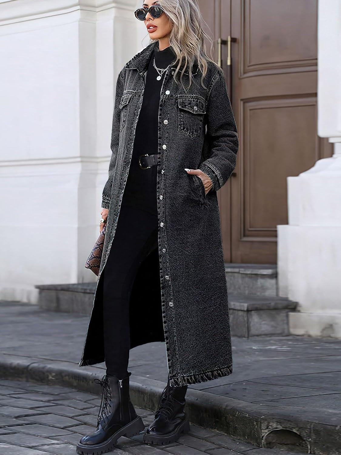 ebossy Women's Single Breasted Denim Duster Trench Coat Lapel Loose Windproof Long Jean Jacket Coat with Pockets