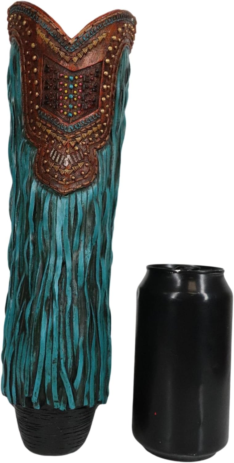 This exotic boot is designed with beautiful multi colors. Artistic tooled leather finishing of the boot and scroll lace patterning makes the case for a 'real' time look of your own boots in your closet! Turquoise fringe frills are added to the boot to add to the rustic charm! This ornate boot is perfect as a sculptural decor or as planter/vase for your flowers/plants!