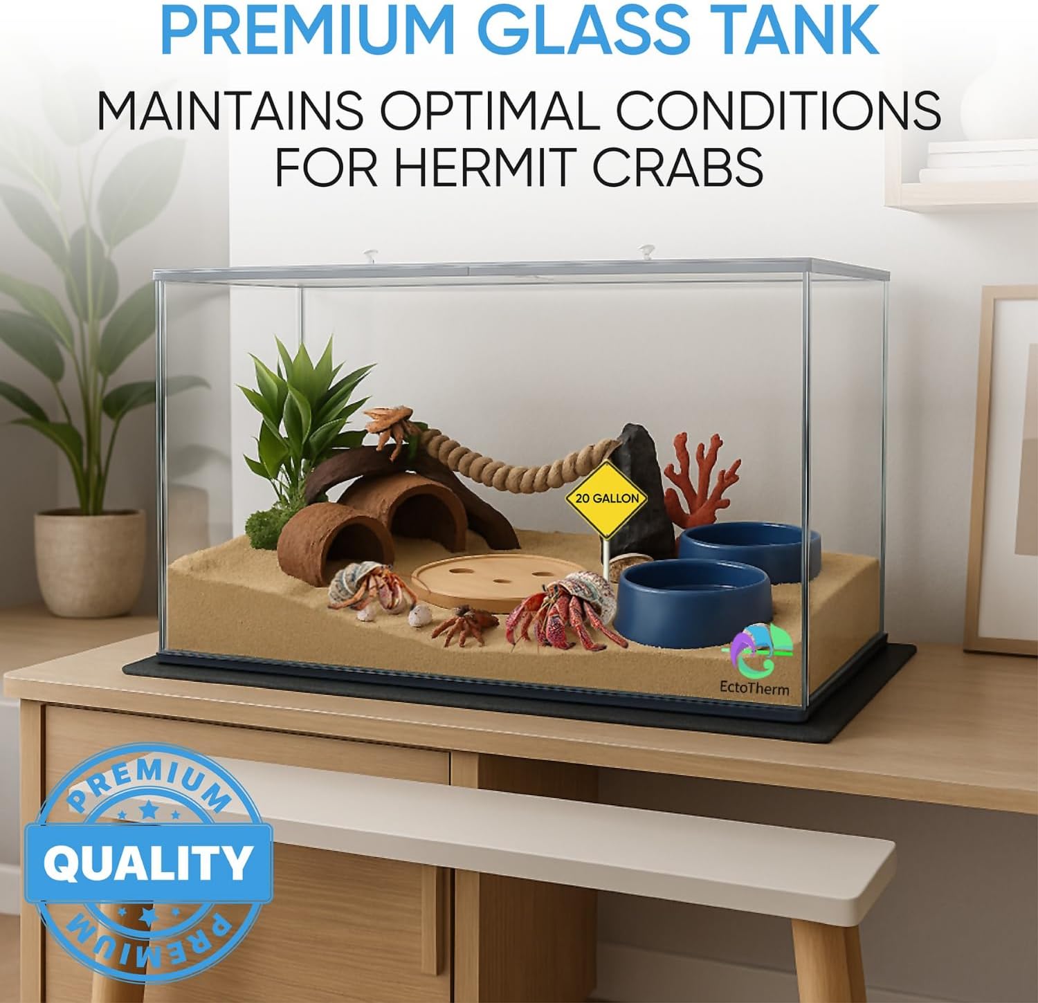 Welcome to the ultimate hermit crab habitat experience with EctoTherms Premium Hermit Crab Tank. This versatile 20 gallon glass tank with the custom designed lid creates the perfect home for your hermit crab companions. Whether you're looking for a large hermit crab cage or a smaller setup, there's a size that will fit your needs. Our hermit crab enclosure is thoughtfully designed to replicate your crabs' natural environment. The durable glass construction maintains proper humidity levels while providing excellent visibility to observe your fascinating pets. The tank dimensions allow ample space for substrate depth, essential for burrowing and molting behaviors critical to hermit crab health. The versatile design makes it suitable for various crab species. The secure-fitting lid prevents escapes while allowing to maintain ideal heat & humidity conditions. Create a beautiful underwater world or desert landscape - this glass terrarium allows for endless creative possibilities. Ideal as a hermit crab aquarium, crab tank, this 20 gallon tank with lid offers the perfect balance of functionality and aesthetics. Give your hermit crabs the home they deserve with our premium hermit crab tank.