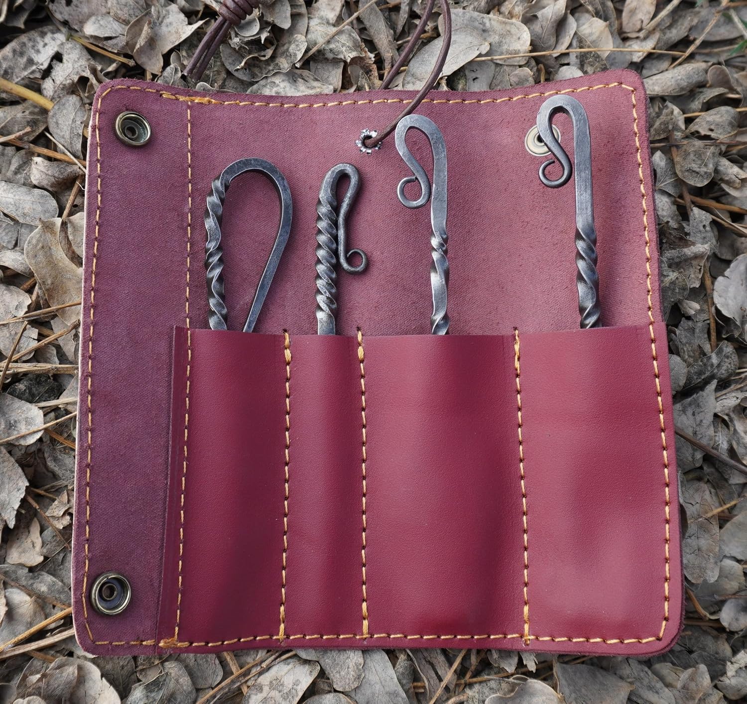 • A Leather Storage Pouch With Belt Loop Included To Easily Carry When Travelling And Each Piece Of This Medieval Cutlery Featured A Curved Handle End With An Eye Hole For Optional Hanging Storage