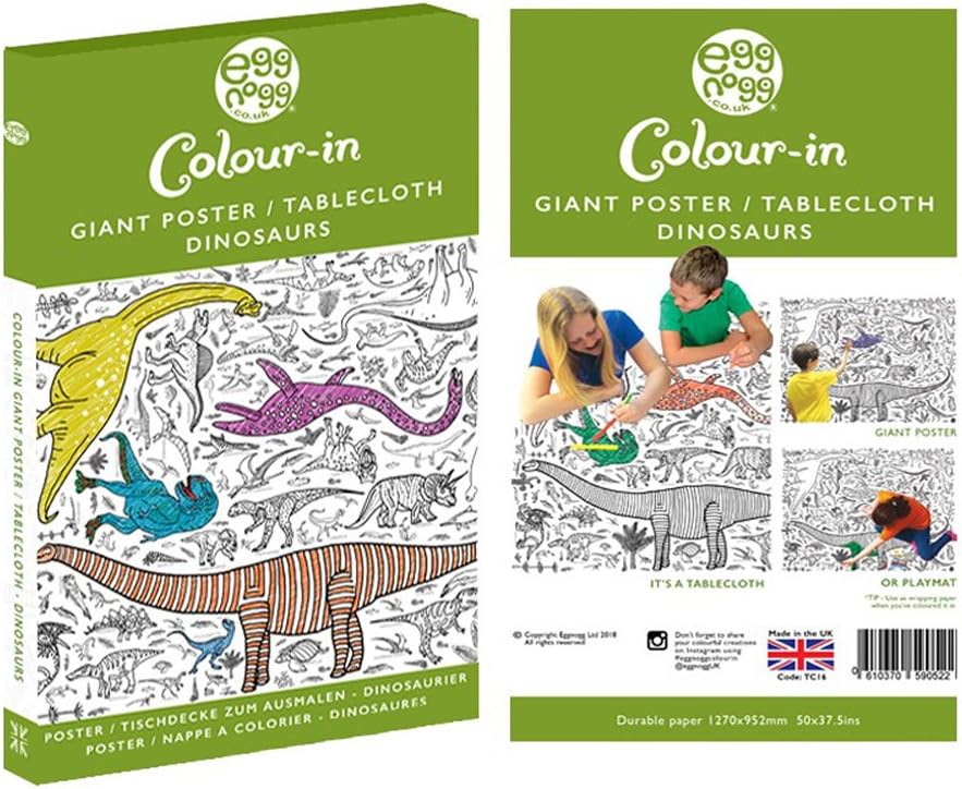 Enjoy a fun-filled coloring-in craft activity for all ages and occasions with the Eggnogg Colour-in Durable White Dinosaur Poster Tablecloth. Covered in all kinds of dinosaurs big and small and spotted and striped. Its a must for the dinosaur lover in your family! All your kids favorite dinosaurs, including Tyrannosaurus Rex, Velociraptor and Stegosaurus. Theyre perfect for childrens parties, party favors, gifts, restaurant visits, weddings, holidays, stocking stuffers, rainy days and playtime. The Colour-in poster tablecloths bring a little calm into the day and the perfect antidote to all that screen time. The poster tablecloths are white, measure 37.5 x 50 and are made from special durable, FSC accredited paper. They are versatile and can work as a poster, tablecloth, play mat and wrapping paper. Suitable for colored pencils, crayons, pastels, chalk, paints and felt tips. The poster tablecloths come beautifully packaged in a box that is easy to carry or send in the mail to make the perfect present. They are designed and printed in the UK. These tablecloths are not appropriate for children under the age of 3.