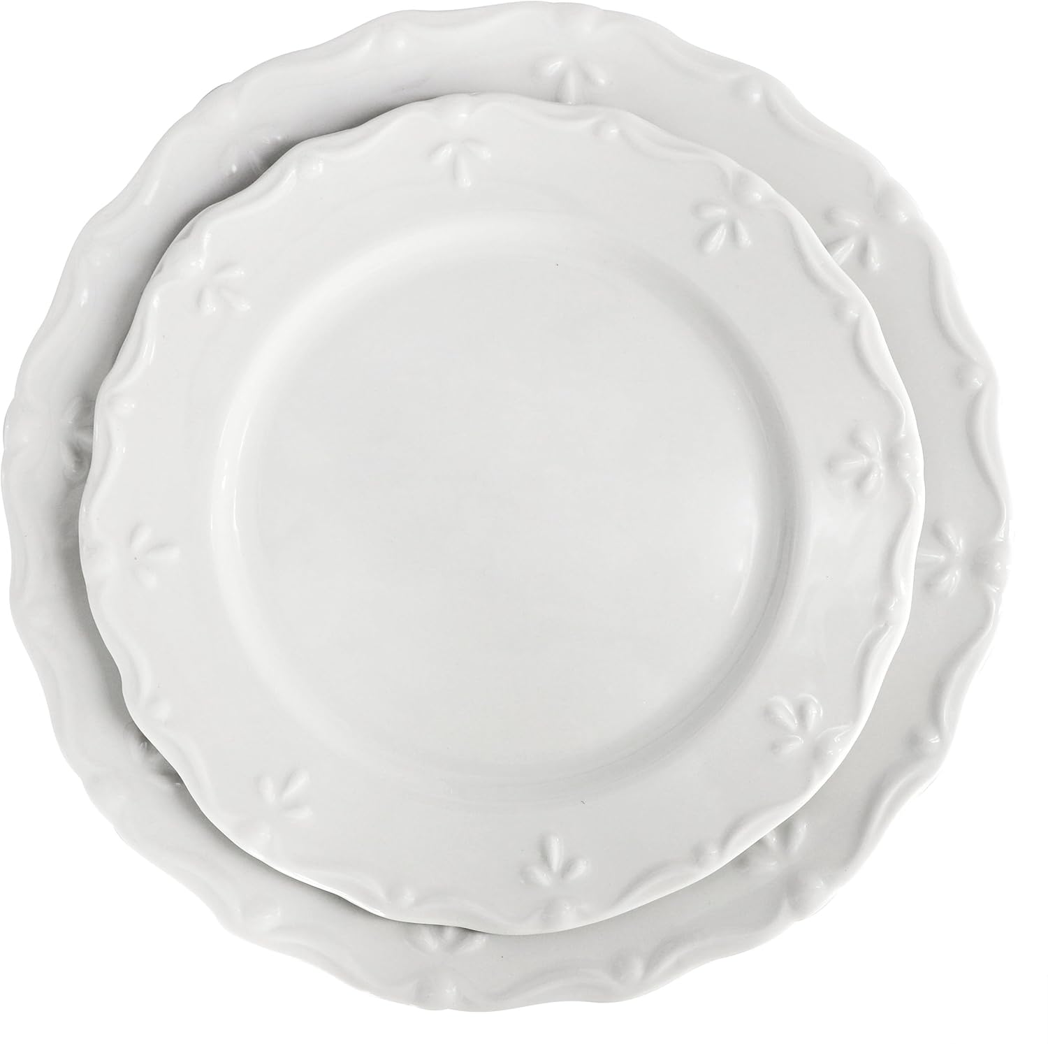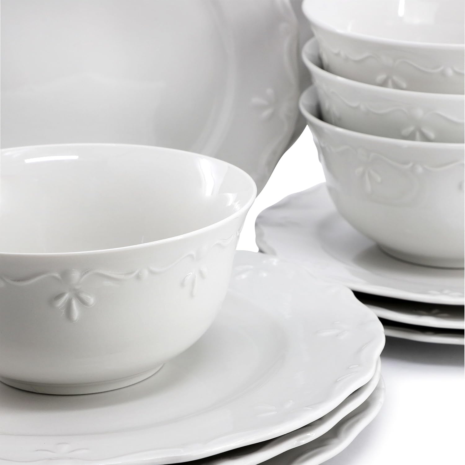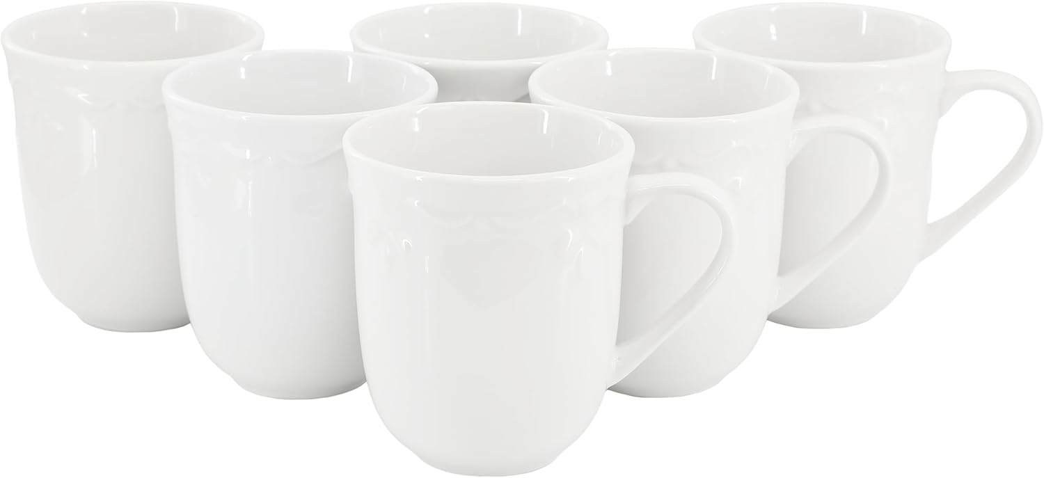 The Elama Henryi 18-Piece Porcelain Dinnerware Set in White is the perfect addition to any home, offering a blend of timeless elegance and practical functionality. Made from durable porcelain, this set features a sleek glossy finish that enhances its refined appearance. The ornate embossed rim detail and scalloped edges add a sophisticated touch to each piece, making it ideal for both casual dining and formal gatherings. The classic white color and round shape ensure this set complements a variety of table settings, while its timeless design suits any home décor.This 18-piece dinnerware set for 6 includes 6 dinner plates, 6 salad plates, and 6 bowls, providing a complete set for family meals or dinner parties. Designed for convenience, the Elama Henryi set is both dishwasher safe and microwave safe, ensuring easy cleaning and hassle-free reheating. Whether you're hosting a dinner event or enjoying an everyday meal, this versatile porcelain dinnerware set offers both style and practicality, making it a must-have for any modern home.