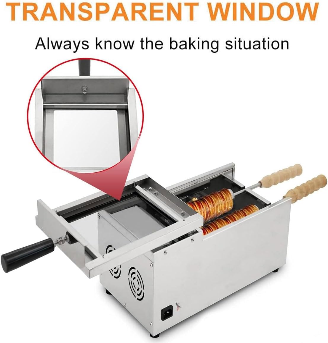 With ice cream chimney cake oven,commercial chimney cake oven,electric chimney bread roll grill maker,you can make ice cream cone chimney cakes at home.Features:Chimney cake roll oven maker has M-types heating tube design for evenly heating and uniform baking. and all stainless steel bodyThis oven is equipped with clear on/off switch and adjustable temperature knob (range from 50°C to 300°C) and sweet and crispy perfection every time.Electric toaster come with a transparent skylight for easy observation of bread at any time.Specifications:Name: Chimney Waffle MakerPower: 1500WMaterial: stainless steel rolling cylinder + stainless steel shellNumber of rollers: 2Roller Type: CylindricalRoller size: diameter 40*length 214mmMachine Size: 462*240*200mmPackage size: 34*60*30cmWeight: 8 kg (17.6LB)Package Includes:1* Electric Chimney Cake Oven2* baking wooden handlesNotes:1. Due to manual measurement, 2-3cm deviation is allowed.2. Different monitors have different calls, and the product color is subject to the actual product.