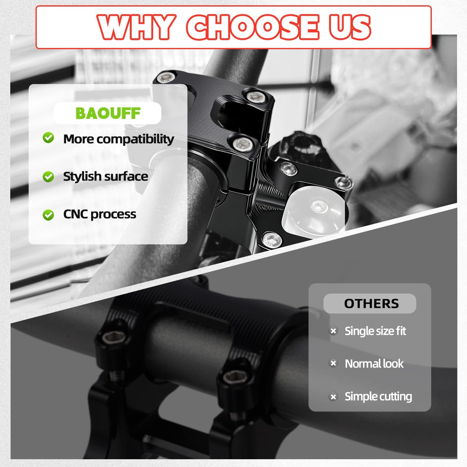 Fitment: For Surron Light Bee S For Surron Light Bee X For Eride Pro S For Eride Pro SS 2.0 For Eride Pro SS 3.0 Features: Crafted from high-grade 6061 aluminum, this handlebar riser clamp delivers superior structural strength without added bulk. A precision-anodized finish coats the 6061 aluminum handlebar riser clamp, blending robust protection with a sleek, race-inspired look. The handlebar mount holder includes a dedicated 25mm riser module. With it installed: 20mm higher and 20mm forward than stock, without: 5mm lower and 20mm forward. Included are 4 precision-machined, corrosion-resistant washers, engineered to expand compatibility to 28.5mm handlebars. Perfect for riders shopping for Surron direct mount stem.