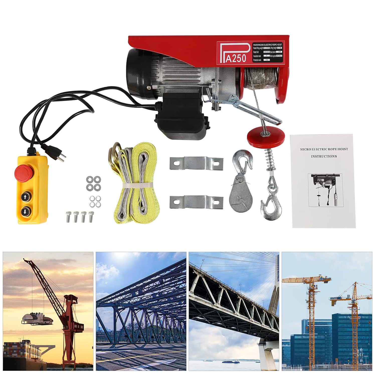 Details💡Wired Remote Controller: It is equipped with a long wired remote control, which allows you to control the lifting and lowering functions of the electric hoist from a safe distance. Also, the red button on it allows for an emergency stop of the equipment to prevent sudden accidents.💡Pure Copper Motor: It adopts a high-powered pure copper motor(510W), with good heat dissipation and stability, providing strong power for lifting.💡Practical Lifting Straps: The package is equipped with two additional lifting straps for securing hard-to-hook goods, so you don't need to buy extra.Application✅The electric hoist is suitable for factories, docks, warehouses, logistics, construction sites, car manufacturers, railways, construction, garages, ceilings, attics, barns, lofts, etc. for lifting regular or irregularly shaped objects. SpecificationsHousing Material: Carbon SteelFinish: Plastic SprayHook Material: Galvanised Alloy SteelCable Material: Galvanised Carbon SteelMotor Housing Material: AluminumMotor Type: Pure Copper MotorColor: RedModel: PA250🔥Plug Type: US Standard 🔥Voltage: 110V-60Hz🔥Power: 510WInsulation Rank: BProtection Rank: IP40🔥Load Capacity: 125kg/275lbs(Single Cable), 250kg/551lbs(Double Cable)🔥Lifting Speed: 32.8ft/min (Single Cable) , 16.4ft/min (Double Cable)🔥Lifting Height: 12m/39.4ft(Single Cable), 6 m/20 ft(Double Cable)🔥Work Quota: 20%10minProduct Size: 35*10*12cm/13.7*4*4.7inLarge Hook Length: 11.5cm/4.5inSmall Hook Length: 10cm/4inPacking Size: 38*16*27cm/14.96*6.29*10.62inGross Weight: 10kg/3.93lbsPackage Included1 * Electric Hoist2 * Lifting Straps1 * Hook2 *Mounting Clamp Brackets1* Wired Remote Control1* English Manual