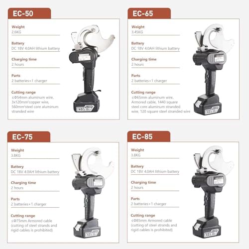 Introducing our Electric Ratchet Cable Cutter, an essential tool for professionals in industries such as electricity, steel, petrochemical, mining, railways, highways, and pipelines. This high-performance cable cutter offers a powerful cutting capacity for aluminum and copper cables, as well as stranded aluminum cables with a steel core. Equipped with a robust 60 kN power output and an efficient 18 V lithium battery, our cable cutter ensures reliable performance with a quick charging time of just 2 hours. With models available for various cutting ranges (EC-50M, EC-65M, EC-75M, EC-85M), you can easily find the perfect fit for your specific needs, capable of handling cables up to 85mm in diameter. Designed for convenience, the Electric Ratchet Cable Cutter comes in a portable plastic case, making it easy to transport and store. The compact package size (43 x 40 x 13 cm) and lightweight design (14.25 lbs) ensure that this cutter is a practical addition to your toolkit, whether you're on-site or in the workshop. Whether you're tackling heavy-duty projects or everyday tasks, this cable cutter provides the precision and efficiency you need to get the job done. Its ergonomic design allows for comfortable handling, reducing fatigue during extended use. Invest in our Electric Ratchet Cable Cutter for a reliable solution that enhances your productivity and meets the demands of your work environment. Experience the difference with our cable cutter, a valuable tool that stands out for its performance and versatility. Please note that slight color variations may occur due to lighting conditions, and manual measurements may have a small margin of error. Always adhere to the specified cutting range to ensure optimal performance.