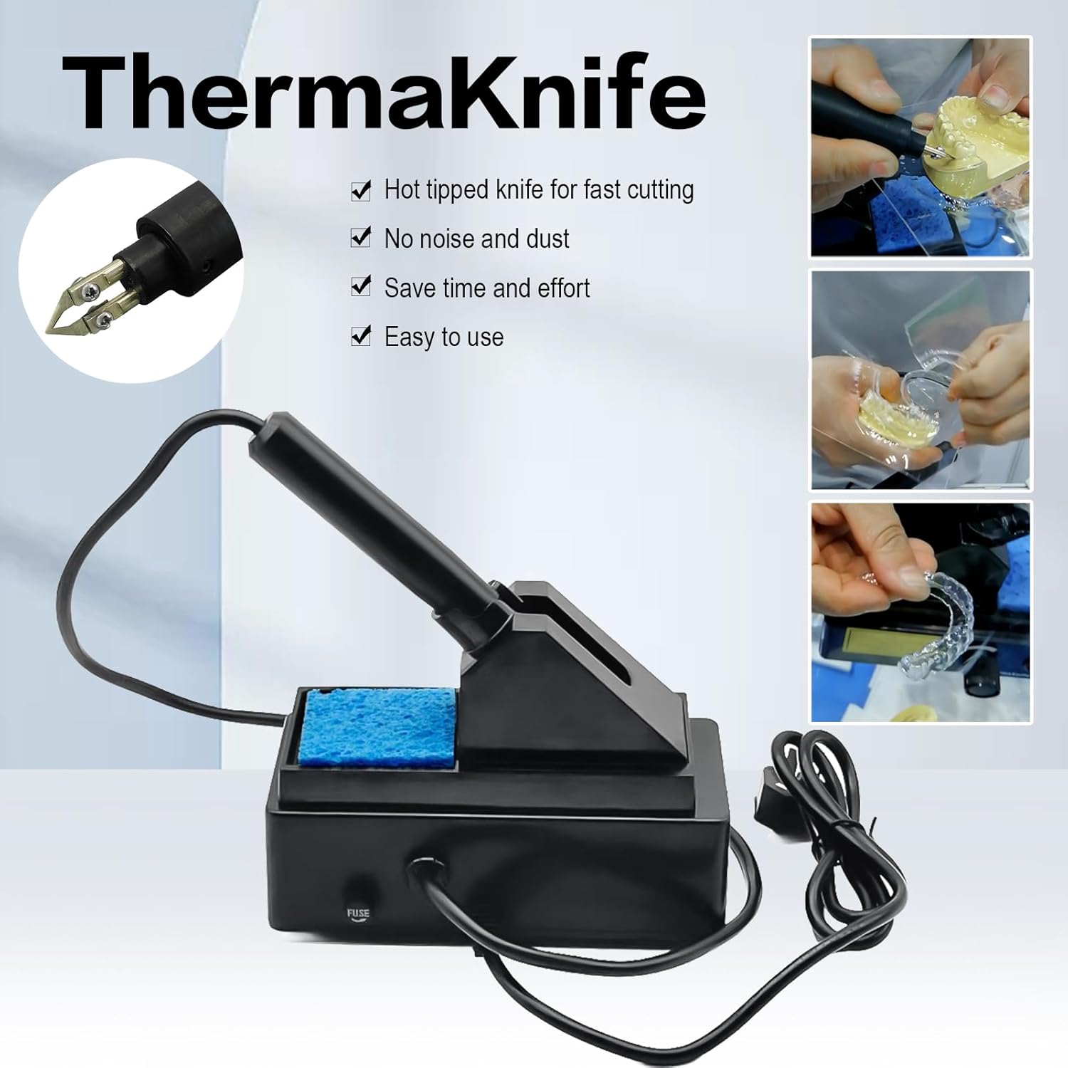 Technical specifications: Power input: AC220V 50Hz, 110V 60Hz Model: TK-1 Power: 20W Handle dimensions: Φ22.5x140mm Main part dimensions: 180x90x140mm Electrical grade: calss 1 Fuse: 250V 1A Net weight: 1.2kg Package size: 22*20*19 cm Packing list: Main part *1 Sponge *2 Spare screws for tip *2 Spare nuts for tip *2 Steel brush *1 Tips (including spare) *2 User manual *1 Wrench *1 Instruction for use 1.Turn on the red power switch on the right side of the device, when the red power switch lights up, it indicates that the power is on, and the device will begin to heat up. 2. Remove the handle from the body of the device, hold the handle, and place the tip on the area of the splints that needs to be cut to carry out the cutting. 3. After the cutting is completed, please promptly turn the temperature control counterclockwise to the minimum, place the handle on the device body, and turn off the power supply in time.