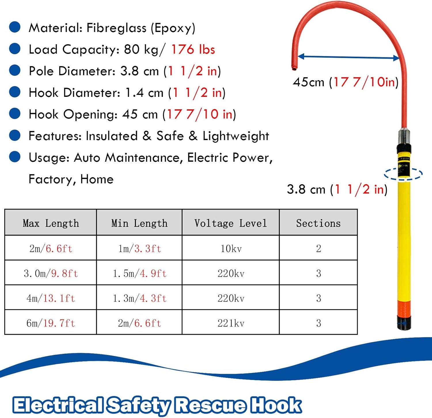 High Voltage Insulation Rescue Sticks are engineered to meet the demands of heavy lifting with an impressive load capacity of 80 kg (176 lbs). These versatile insulated rescue hooks are not confined to a single industry; they are essential tools for electrical maintenance, search and rescue missions, and various public operations such as those found in supermarkets and shopping malls. They are particularly beneficial in high-altitude environments like construction sites, high-voltage towers, and substations.Product Specifications:1. Material: Fiberglass (Epoxy)2. Load Capacity: 80 kg (176 lbs)3. Pole Diameter: 3.8 cm (1 1/2 in)4. Hook Opening: 45 cm (17.7 in)5. Hook Diameter: 1.4 cm (1/2 in)6. Length Options: - 1 - 2 m (3.3 - 6.6 ft) - 1.5 - 3.0 m (4.9 - 9.8 ft) - 1.3 - 4 m (4.3 - 13.1 ft) - 2 - 6 m (6.6 - 19.7 ft)7. How to Use: Ideal for pulling the body from the waist, armpits, and other easily accessible areas.Features:1. Constructed from insulated fiberglass for safety and durability.2. Non-slip grip for ease of operation.3. Strong load-bearing hook designed to minimize the chance of falling.4. Lightweight design for portability, easy to clean and maintain.5. Suitable for safe rescue operations near high-voltage power equipment.Packaging Information:- Insulated Rescue HookWarm Tips:1. Ensure the surface of the insulated rescue hook is dry before use.2. It is advisable to wear insulated gloves while operating; hands should not cross the boundary of the hand-held part.3. Minor measurement errors of up to 1 cm may occur due to different batches and manual measurements.