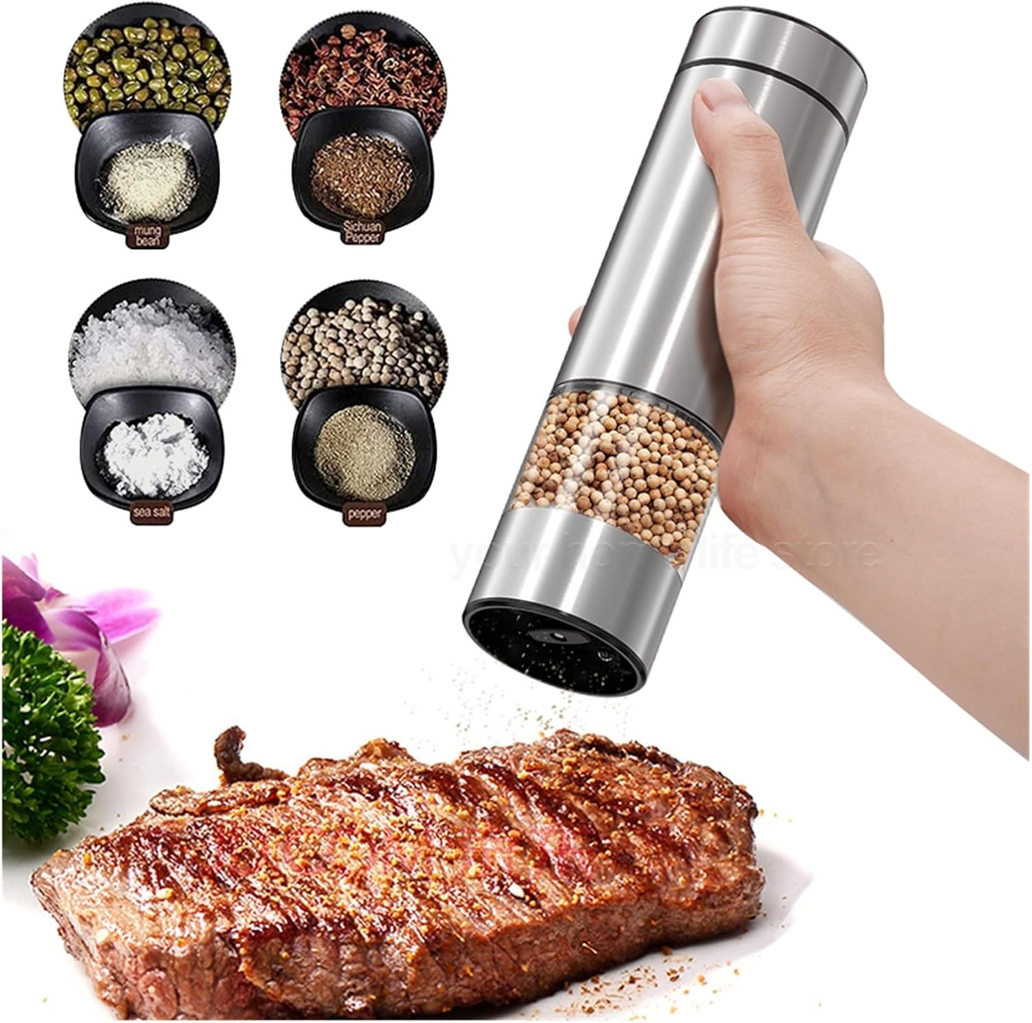 Pepper MillsName:Electric Salt and Pepper GrinderMaterial:Stainless Steel, Ceramic, AcrylicOperation Mode:AutomaticSize:176×52m[A] ,182×52m[B] Model Number : K-003Metal Type : Stainless steelMaterial : Metal