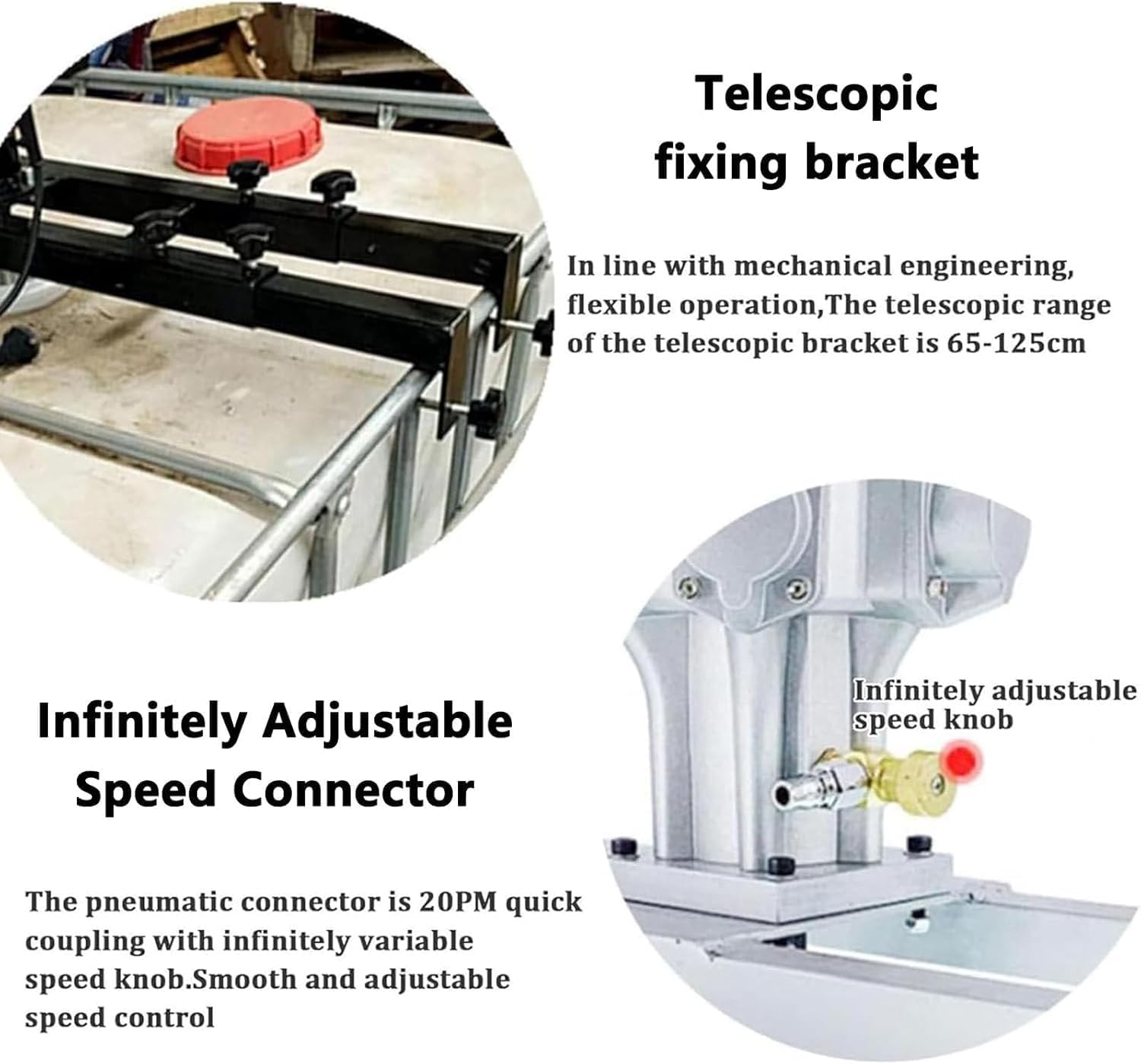 The 3280W IBC Electric Mixer is an essential tool for professionals seeking efficiency and versatility in their mixing tasks. Specifically designed for mixing tasks in various applications, this powerful paint mixer accommodates tank sizes from 200 to 1200 liters, making it ideal for both small and large projects. Featuring a robust 3280W motor, the mixer offers adjustable speeds ranging from 0 to 800 RPM, allowing you to customize the mixing process to achieve the desired consistency. The retractable fixing knob ensures a secure fit, providing stability during operation and making it easy to adjust for different tank sizes. Equipped with multiple blade sizes, including 400 mm, 250 mm/200 mm, and 160 mm/220 mm, the stainless steel mixing blades are designed for durability and efficiency. The 900 mm stirring rod reaches deep into tanks, ensuring thorough mixing of even the most viscous materials. With a horizontal plate telescopic range of 65-125 cm, the mixer adapts to various tank heights, enhancing its usability. Before use, please note that this pneumatic tool requires connection to a pneumatic pump unit (air compressor) for optimal performance. Ensure your air compressor is a screw type for effective operation. Whether you're mixing paint, adhesives, or other materials, the IBC Electric Mixer offers the reliability and performance you need to complete your projects with confidence. For any inquiries, feel free to reach out to our customer service team via email, and we will assist you promptly. Upgrade your mixing experience with our high-quality electric mixer today!