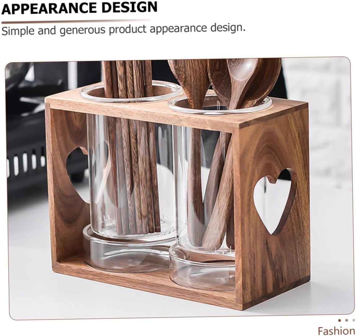 Package Include 1 Rack 2 x Glass Tanks 2 Collecting Dishes Features -Color:Multi Glass Container with Wood Rack -Size Dish: Approx. 2.8X8.8cm/1.10X3.46in Chopstick Drain Rack -Size Wood Rack: Approx. 20.00X15.50X9.50cm / 7.86X6.09X3.73in Kitchen Accessories -Size Glass Tank: Approx. 12X8.5cm / 4.72X3.35in Spoon Container with Wood Shelf -Material: High Borosilicate Glass & Wood Cutlery Rack - Natural, fashionable and simple, health and environmental protection Household Rack for Chopstick. - All kinds of tableware, such as spoon, chopsticks, fork, can be collected time for neat planning Tableware Organizer. - Equipped with two dishes on the bottom, designed for collecting the drained water Glass Chopsticks Holder. - With fine and transparent tableware container, conveneint to find and watch the stored contents Simple Tableware Stand. - Drain holes design can keep your tableware clean and dry, prevent the production of Storage Rack.Goods DescriptionCutlery Organizing Rack With beautiful appearance, it will its popularity and practicability.Home Chopstick Rack Suitable for storage of chopsticks and other cutlery.Tableware Organizer This product is Japanese style kitchen chopsticks draining rack, which is made of for and use