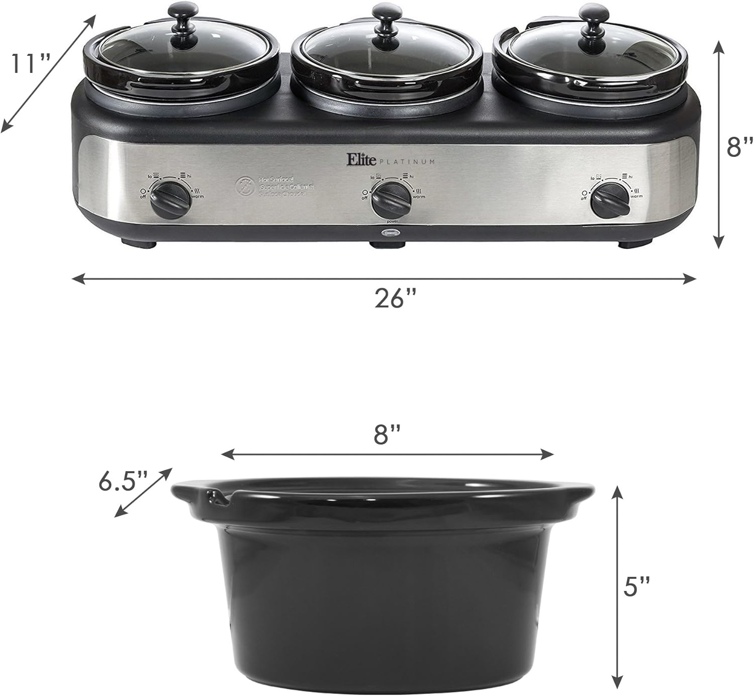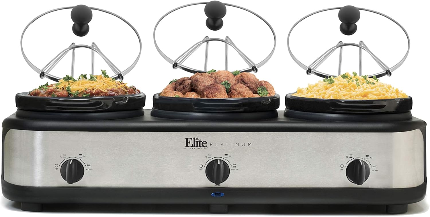 Cook and serve 3 dishes at the same time With the triple slow cooker buffet with lid rests by Elite Gourmet. Slow cooking allows for better distribution of flavors in many of your favorite recipes. This is made possible by cooking for extended periods of time at lower temperatures to let the flavor in. A total of 3 x 2.5 Quart stoneware pots are heated by 3 independent, adjustable temperature knobs to give you full control. You can cook or warm 3 different portions of food at different temperatures, all at the same time! Perfect for slow cooking and serving roasts, soups, and stews! This unit also features lid rests to make serving at parties an easy, No hassle, no mess affair.