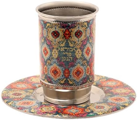 Celebrate Shabbat and Jewish holidays with elegance and style using this stunning Kiddush cup set by Yair Emanuel. Made of sturdy stainless steel and decorated with a vibrant enamel design, this goblet with matching saucer combines modern artistry with timeless tradition. The Kiddush cup holds 8.4 fl oz (250 ml), making it the perfect size for Shabbat blessings over wine. The included plate (6" diameter) completes the set and protects your table from spills. Designed by famous Israeli Judaica artist Yair Emanuel, this Kiddush cup showcases his signature style—fusing traditional Jewish motifs with bold colors and modern materials. Whether for your own table or as a meaningful gift for a wedding, bar mitzvah, or Jewish holiday, this Kiddush cup set is sure to be cherished for years.